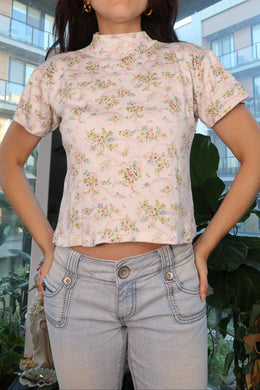 Vintage 90s White Floral Mock Neck Baby Tee with Pink Ribbon Floral Print