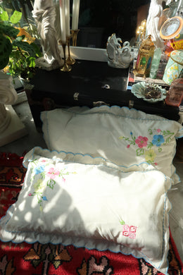 Vintage Embroidered Pillowcases with Scalloped Edges and Embroidered Floral Design