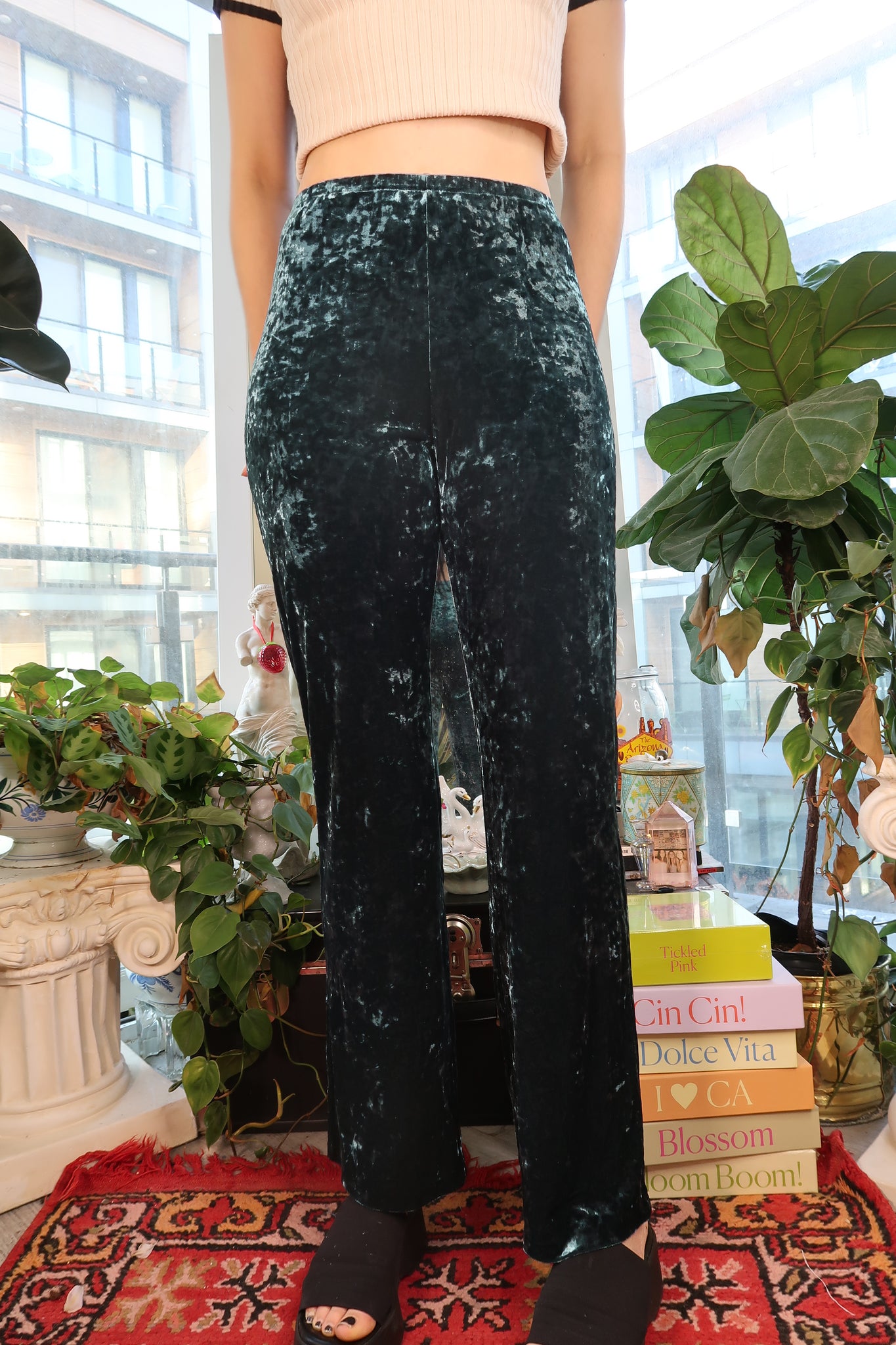 Striking vintage 1990s crushed velvet pants in a deep, moody teal with a rich, light-catching sheen. These pants feature a sleek, straight-leg silhouette with a smooth, clean waistband that sits flat through the hips, creating a flattering, elongating line. The crushed velvet texture gives them a soft, tactile finish with natural variation in tone, shifting from inky green to blue-teal depending on the light.
