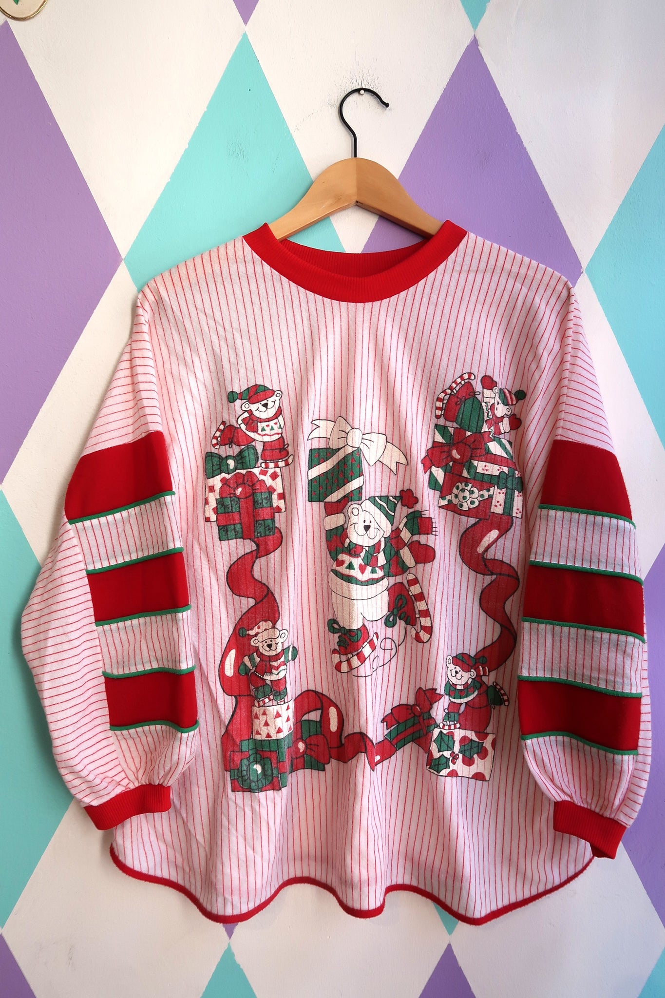 This vintage 90s Christmas pullover features adorable polar bear figures stacked among wrapped holiday gifts, with curling red ribbon details flowing through the design. The playful bear characters are arranged across the front in a vertical holiday scene, set against a red and white pinstripe background for a bold, nostalgic 1990s Christmas look.