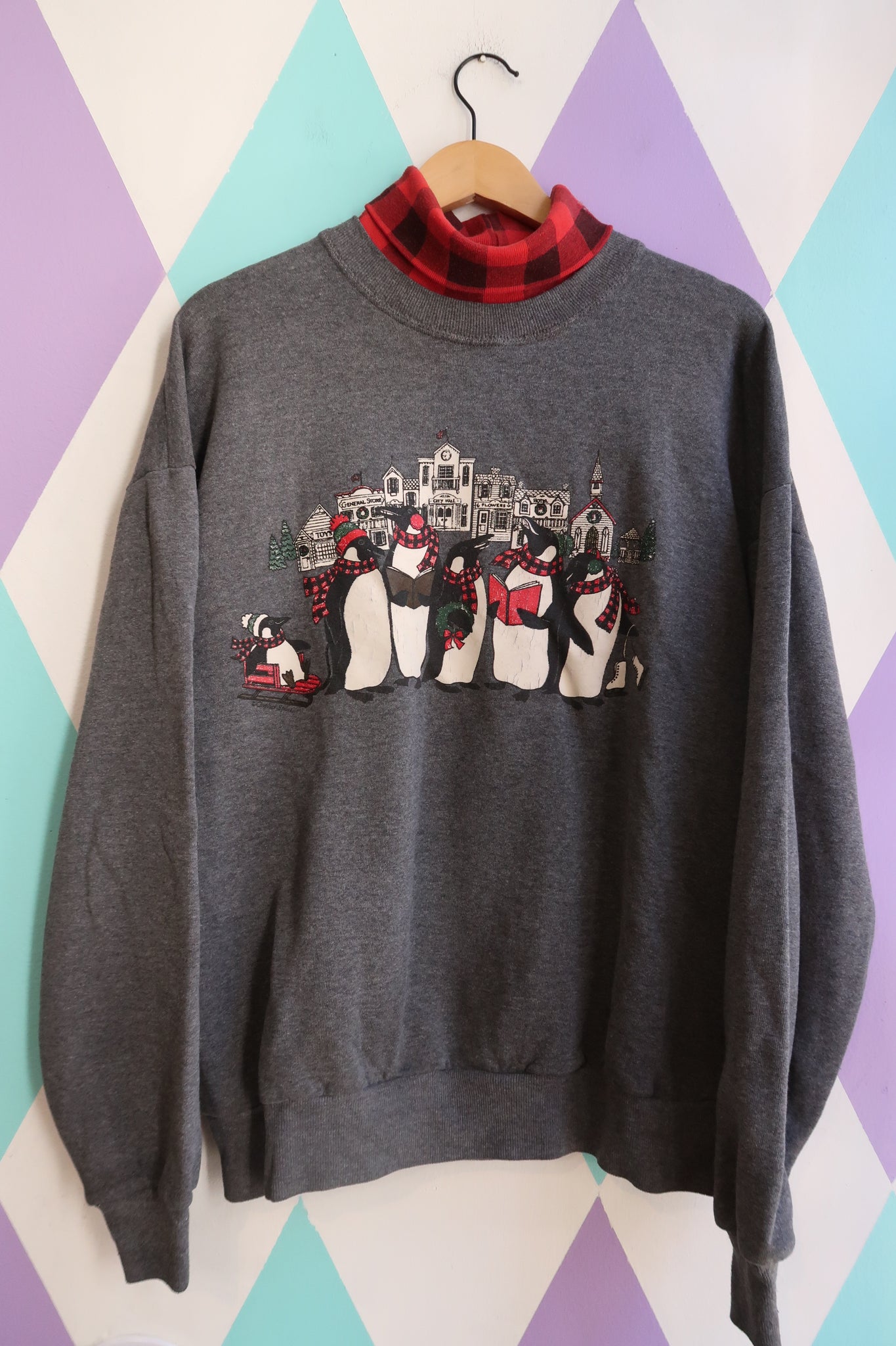This vintage 90s holiday sweatshirt features an adorable penguin winter scene graphic with multiple penguins dressed in red scarves set in front of a snowy village backdrop. The detailed holiday artwork spans the chest, giving it that classic nostalgic 1990s Christmas sweater aesthetic. The standout red plaid mock neck collar adds a cozy layered look and extra festive charm.