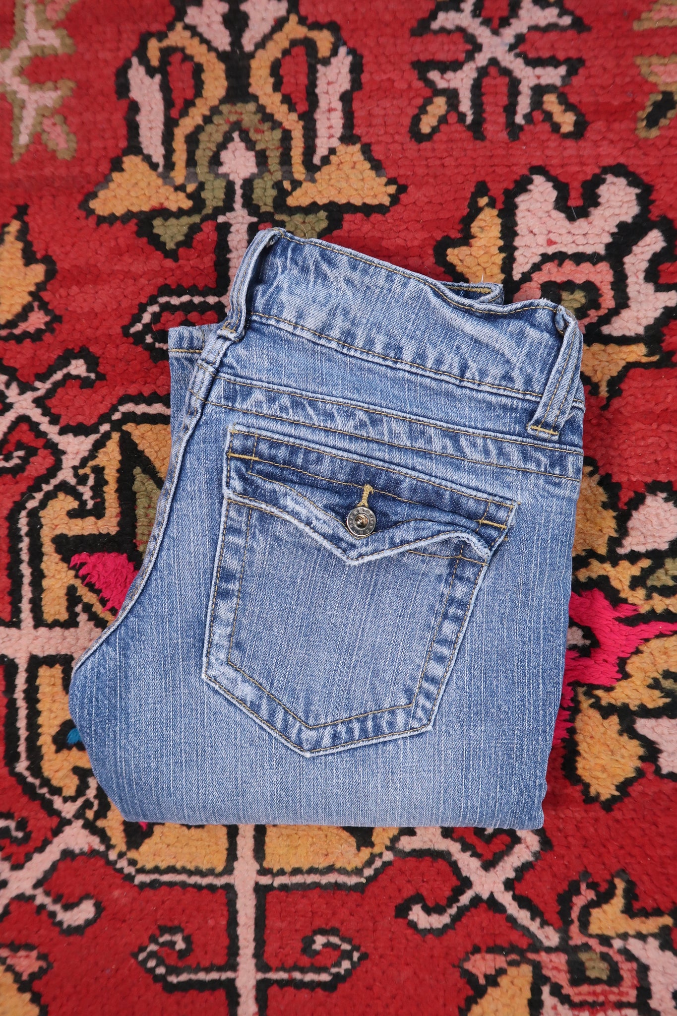 Crafted from soft, stretch denim for a flattering shape and comfortable wear, these jeans pair effortlessly with everything from halter tops to vintage tees — the perfect throwback staple for any Y2K-inspired wardrobe.