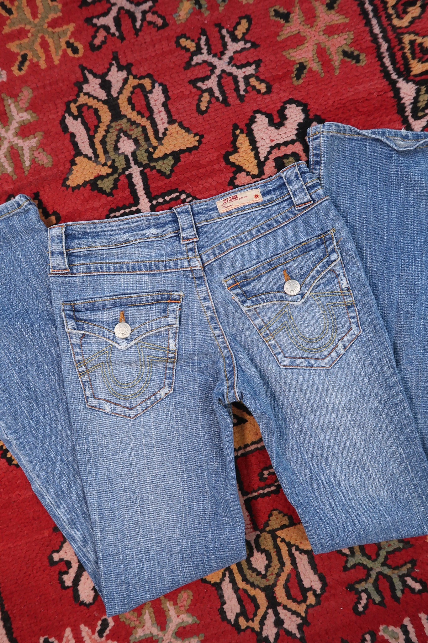 These 2000s Joy Jeans capture the perfect early Y2K denim aesthetic — featuring a medium blue wash, low-rise waist, and bootcut silhouette that hugs and flares in all the right places. The signature embroidered back flap pockets with contrast stitching and metal button closures give that classic 2000s designer-inspired edge.