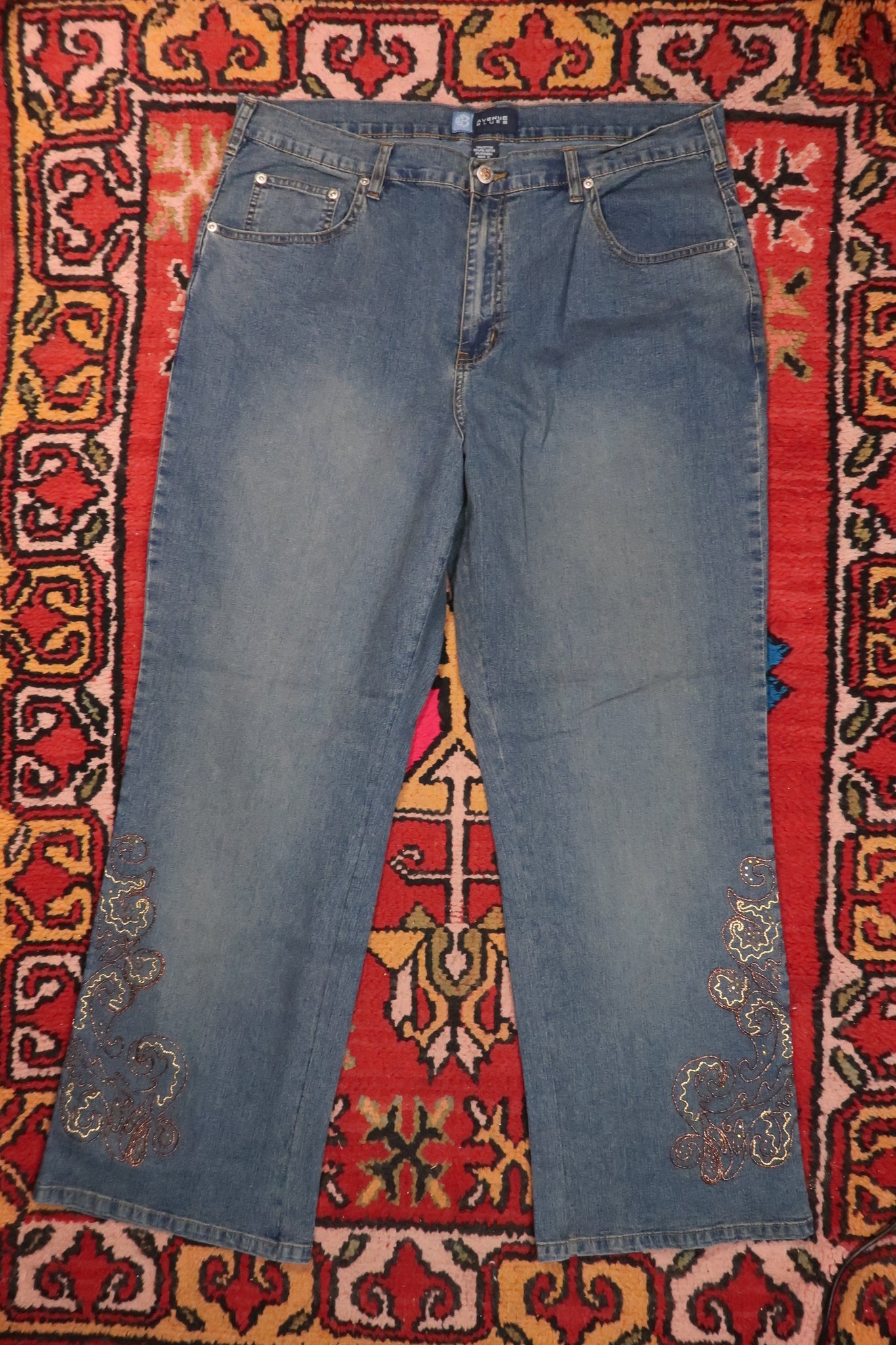 These vintage 2000s jeans perfectly capture early-Y2K style with their subtle bootcut silhouette and ornate embroidered detailing near the hems. Crafted from soft medium-wash denim, they feature floral-style embroidery with metallic thread accents, adding a touch of sparkle and personality to a classic denim shape.