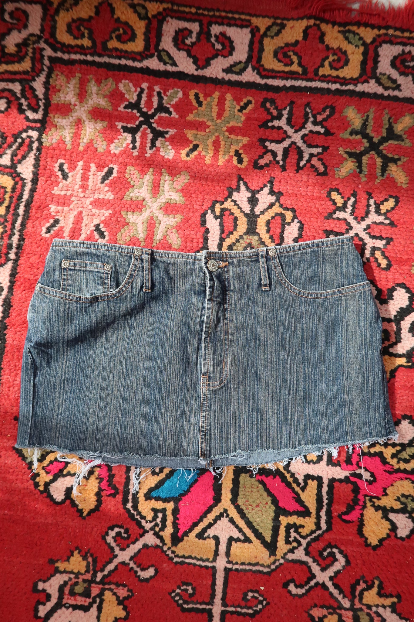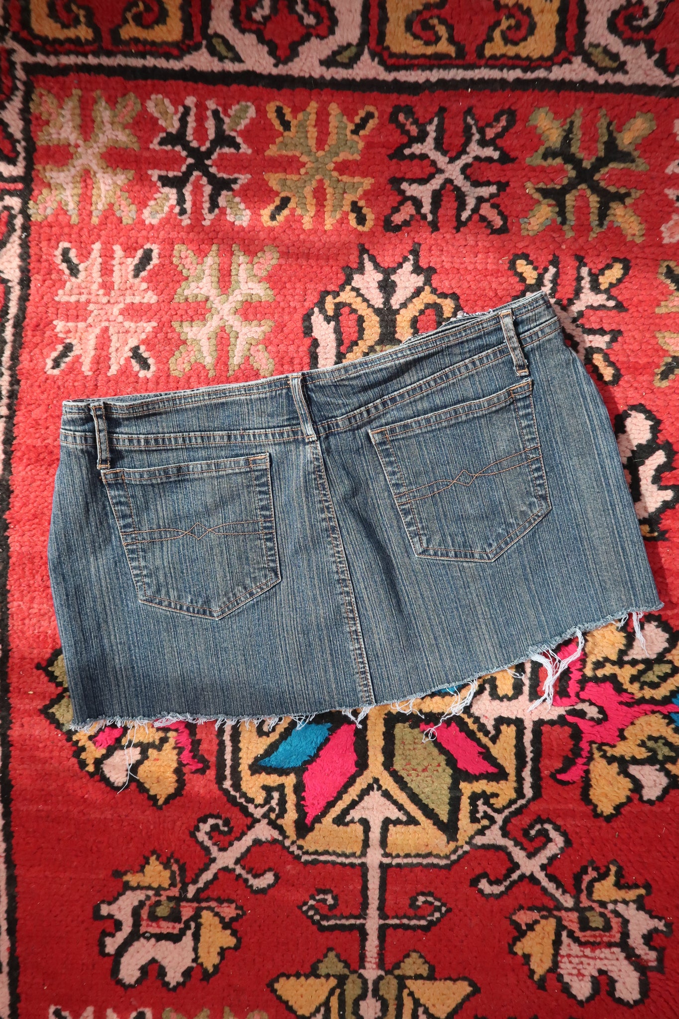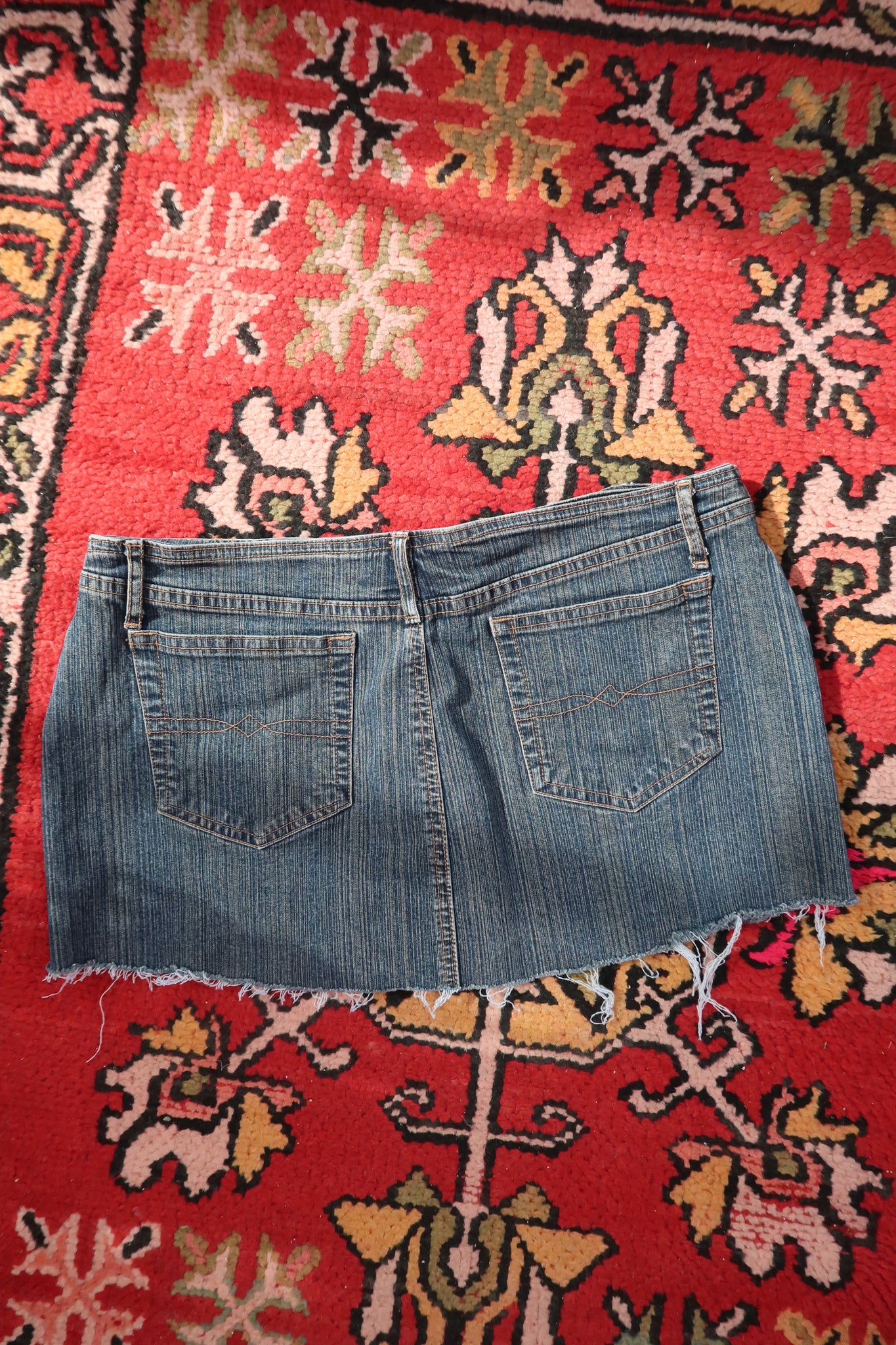 This vintage denim mini skirt has the perfect lived-in edge — crafted from classic mid-wash denim and reworked with a raw frayed hem for an effortless Y2K vibe. Designed with a five-pocket layout, zip fly with button closure, and fitted low-rise waist, it flatters the hips while keeping that casual, easy silhouette.