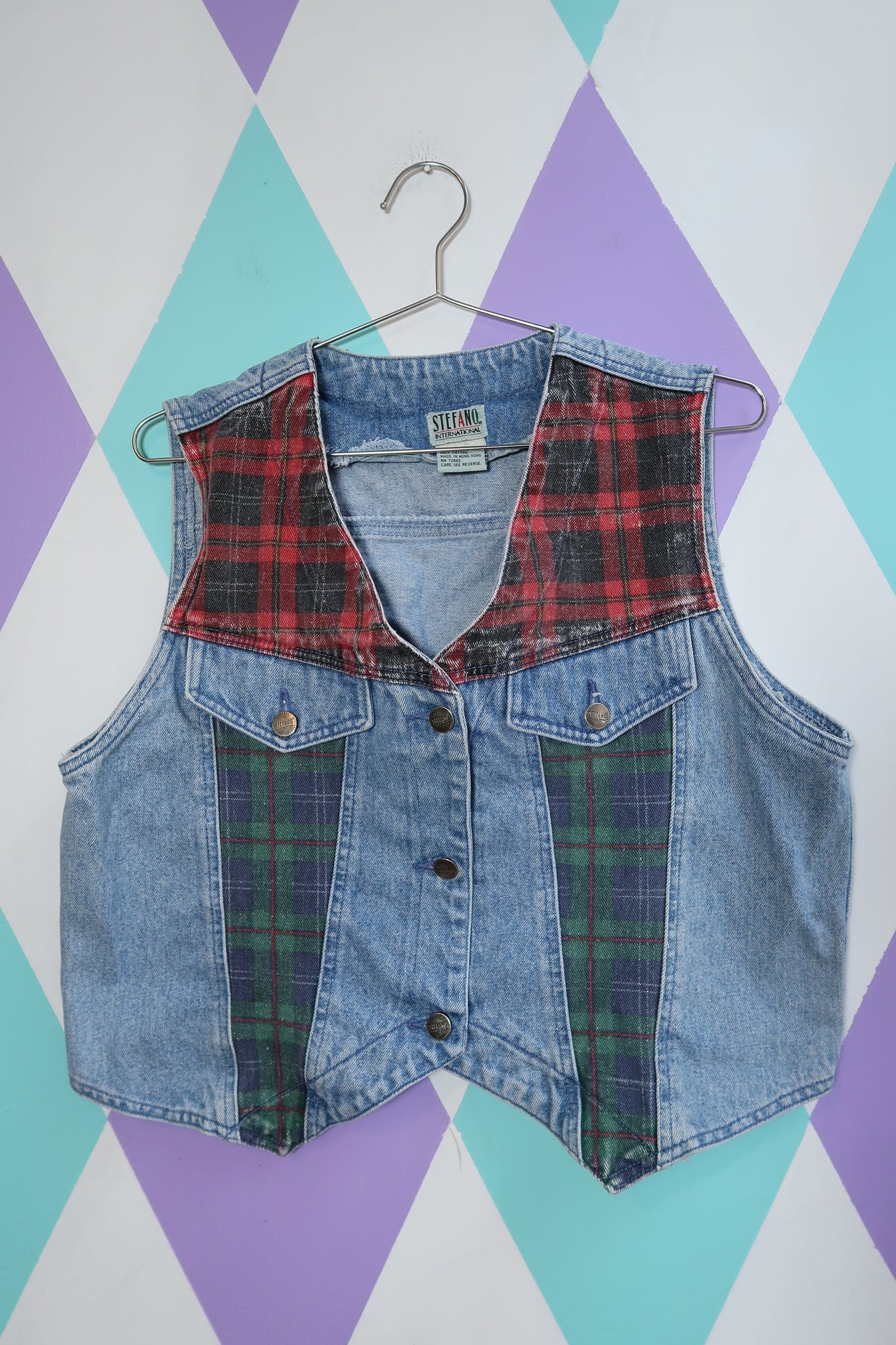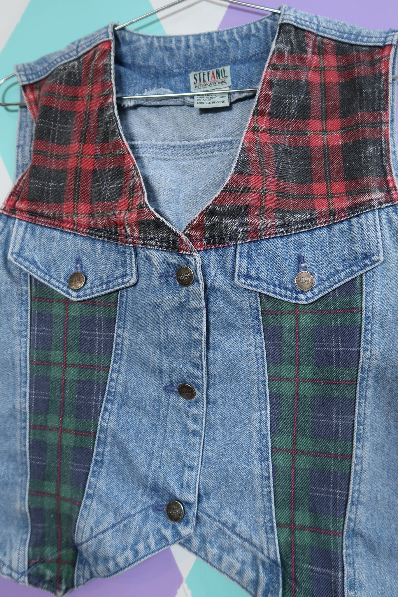 This vintage Gitano denim vest blends rugged denim with classic tartan plaid accents, creating a bold and distinctly late-80s to early-90s statement piece. The design features medium-wash denim panels contrasted with red and green plaid insets across the front and shoulders, adding texture and a touch of punk-inspired charm.