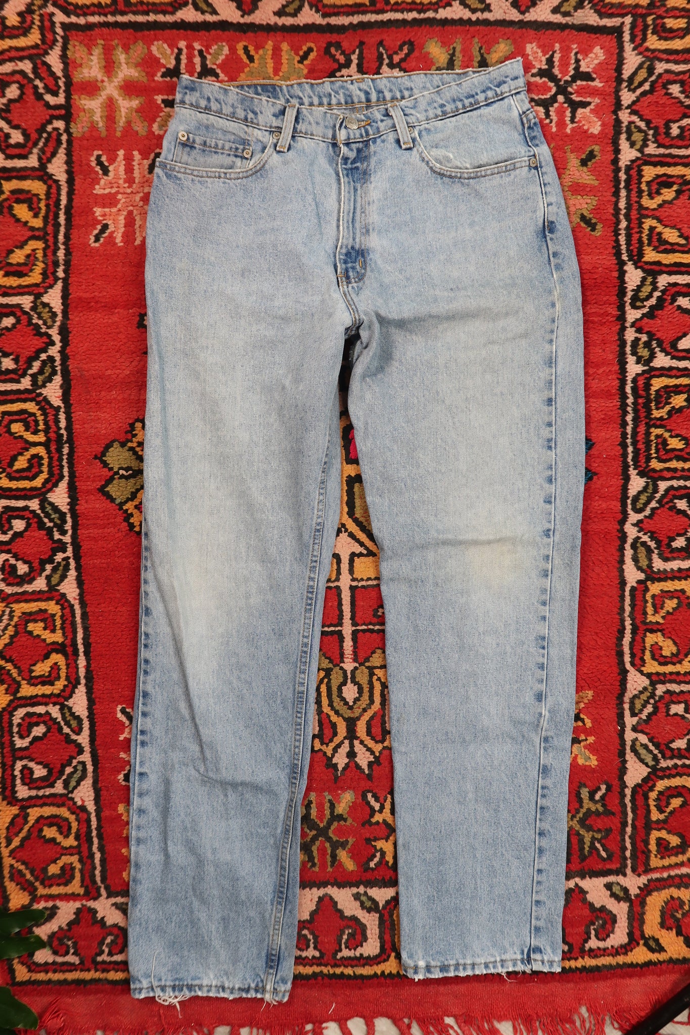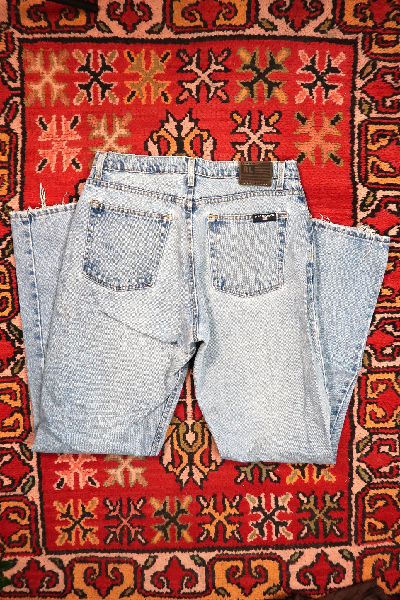 Vintage Polo Jeans Co. denim jeans in a classic light wash with natural fading and visible distressing throughout. Features a traditional five-pocket design with branded back patch, straight leg cut, and an easy, broken-in look that reads effortlessly vintage. The light wash gives these jeans a worn, sun-faded appearance, while the distressed hems and subtle wear add authentic character without feeling overdone.