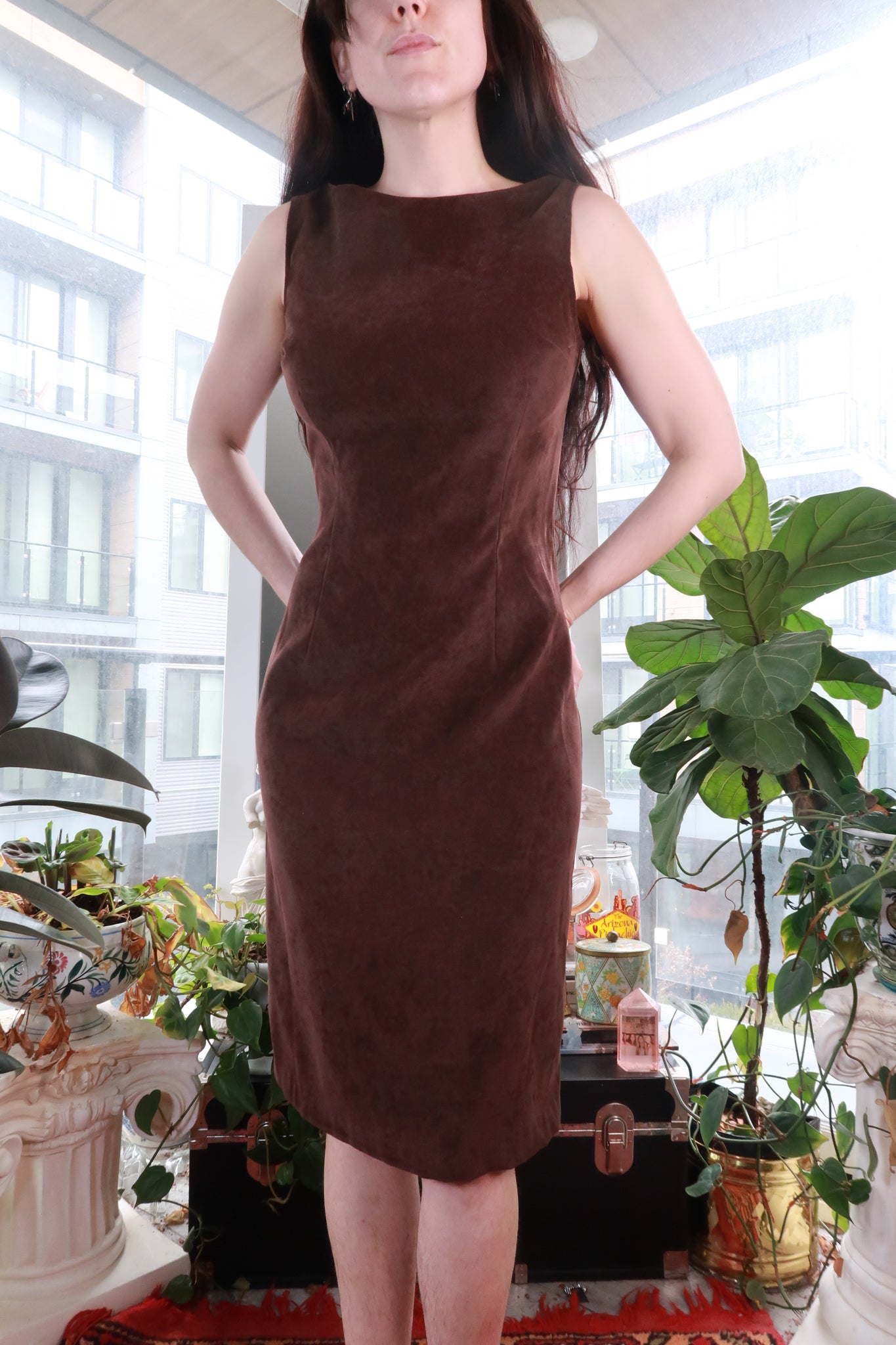 Vintage brown faux suede sleeveless sheath dress featuring a sleek, tailored silhouette with clean vertical seam detailing that contours the body for a flattering structured fit. The rich chocolate brown suede look gives the dress a soft matte texture and luxurious feel while maintaining a minimalist, sophisticated design. A wide boat neckline and sleeveless cut create a timeless, polished look that pairs effortlessly with boots, heels, or layered outerwear. The streamlined knee-length silhouette channels classic vintage elegance with subtle 90s minimalism and understated luxury.