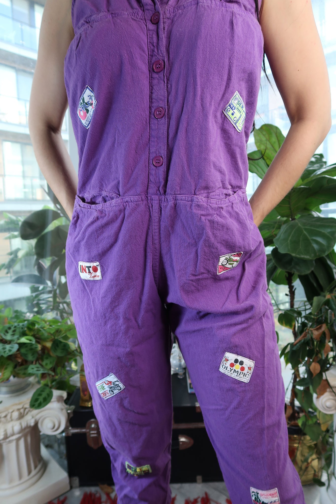 A fun and distinctive vintage purple jumpsuit with colorful patches and effortless throw-on appeal.