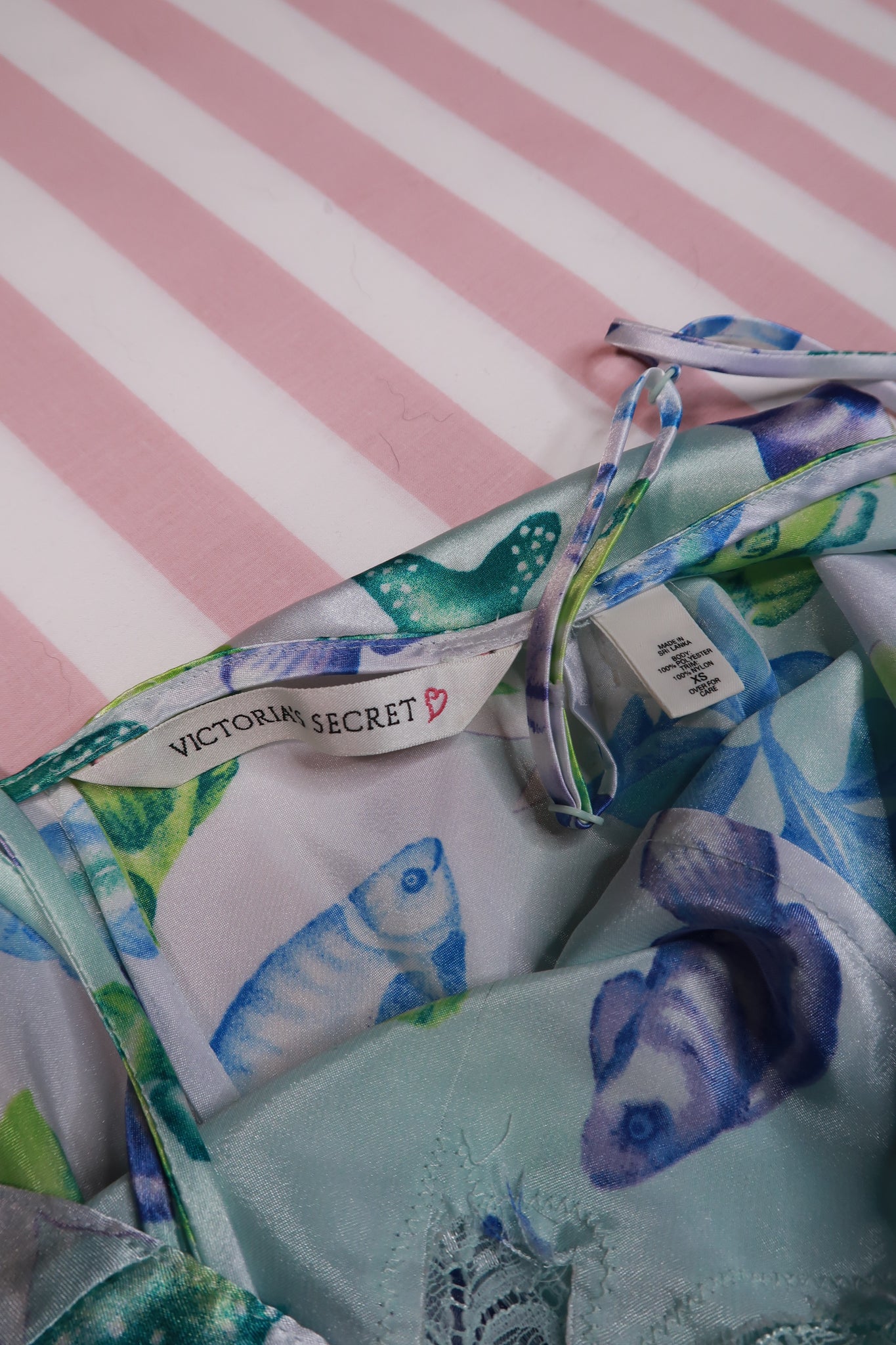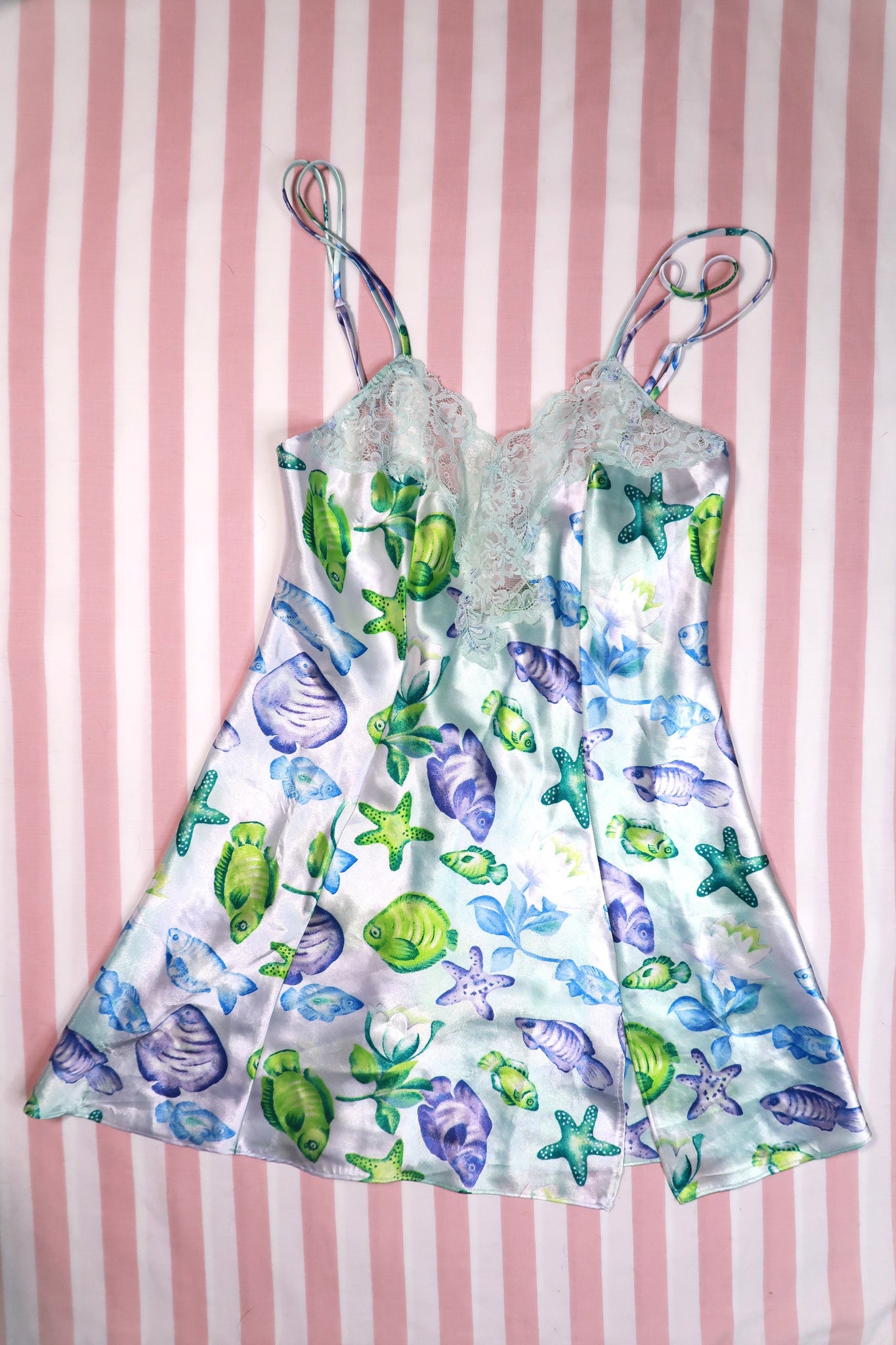 Playful vintage 2000s Victoria’s Secret slip dress featuring a pastel ocean-inspired print with delicate lace bust detailing and classic Y2K lingerie styling. The silky, lightweight satin fabric is covered in colorful fish, shells, and starfish motifs that create a whimsical seaside look, while the lace-trimmed bust adds romantic texture and soft shaping. A sheer lace inset cascades slightly below the neckline, enhancing the feminine silhouette.