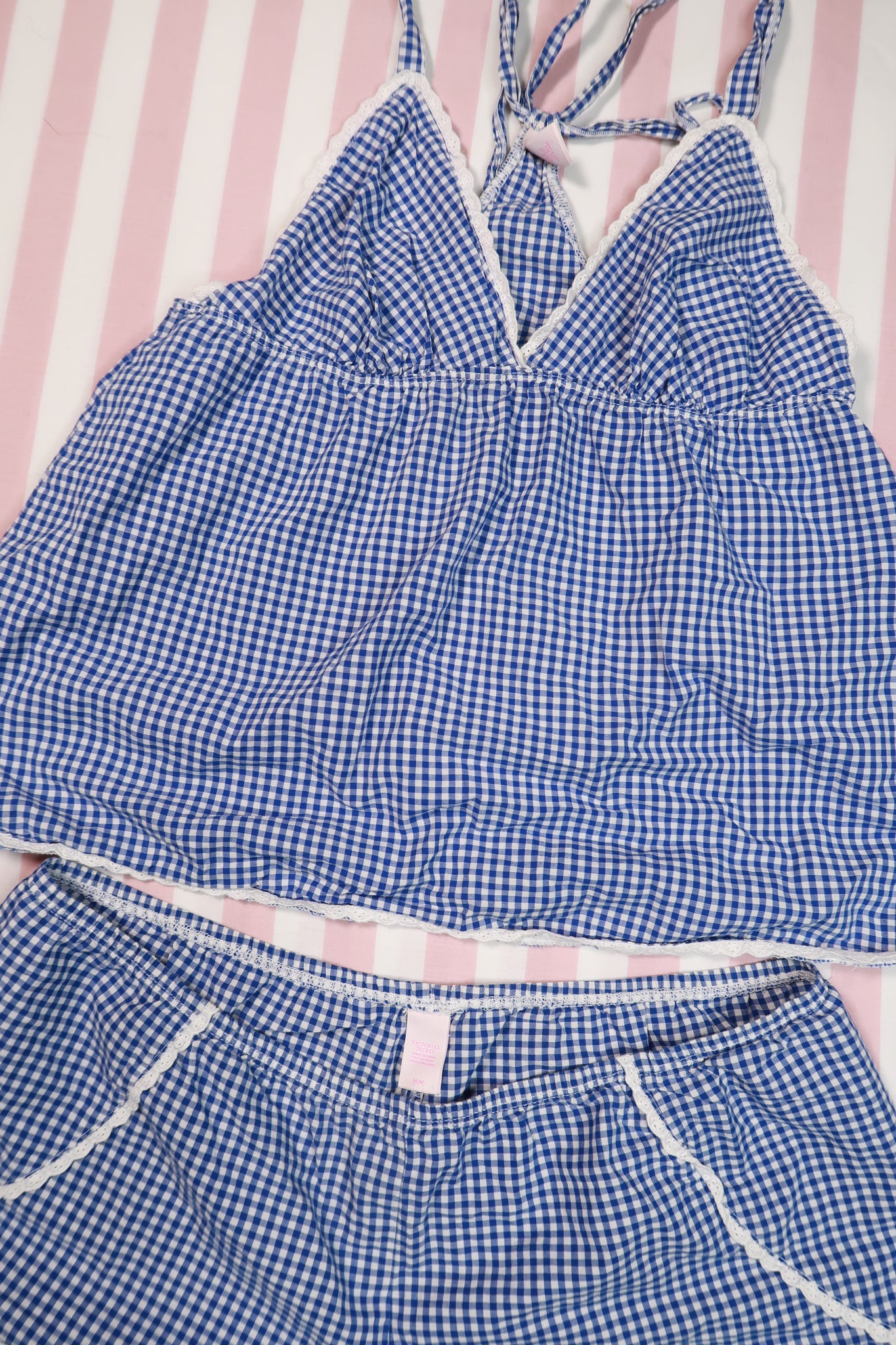 Playful 2000s Victoria’s Secret gingham camisole and shorts set in classic blue and white with delicate lace trim and signature Y2K sleepwear styling. The lightweight fabric features an allover micro gingham print that gives the set a sweet, nostalgic look, while soft lace edging frames the neckline, hem, and shorts for feminine contrast. The camisole is designed with a triangle bust and gathered underbust seam for gentle shaping, flowing into a relaxed silhouette that drapes comfortably.