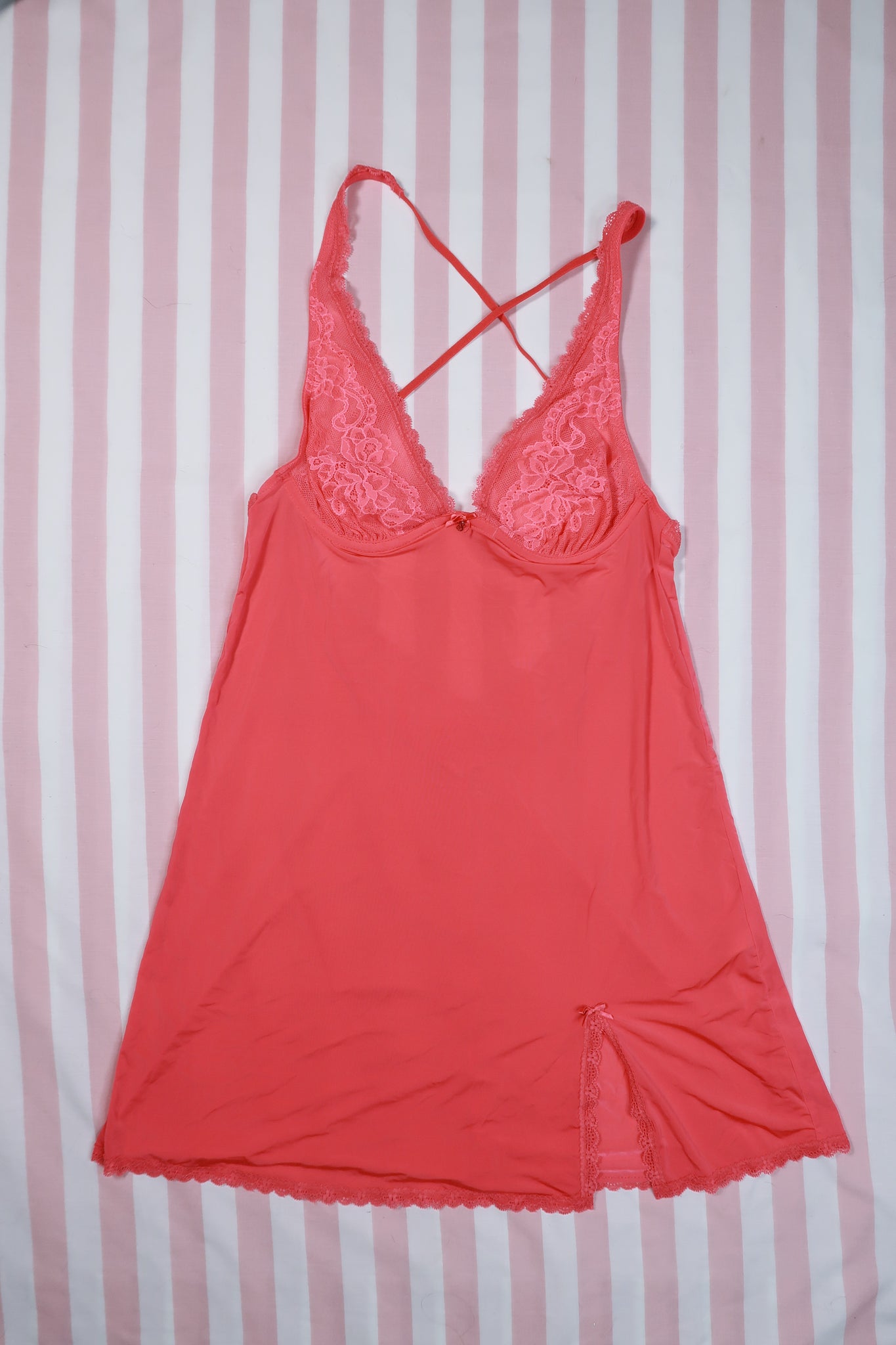 Flirty vintage 2000s Victoria’s Secret slip dress in vibrant coral with lace halter bust detailing and signature Y2K lingerie styling. The triangle bust is crafted from sheer floral lace that creates soft contrast and feminine texture, while the smooth, lightweight body skims the figure for a sleek, body-contouring silhouette. A tiny center bow accent adds a delicate finishing touch.