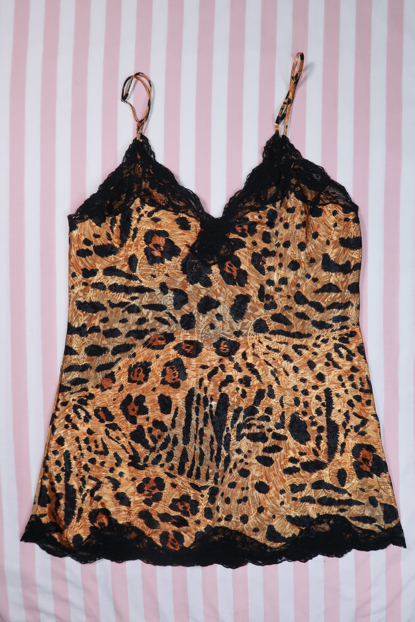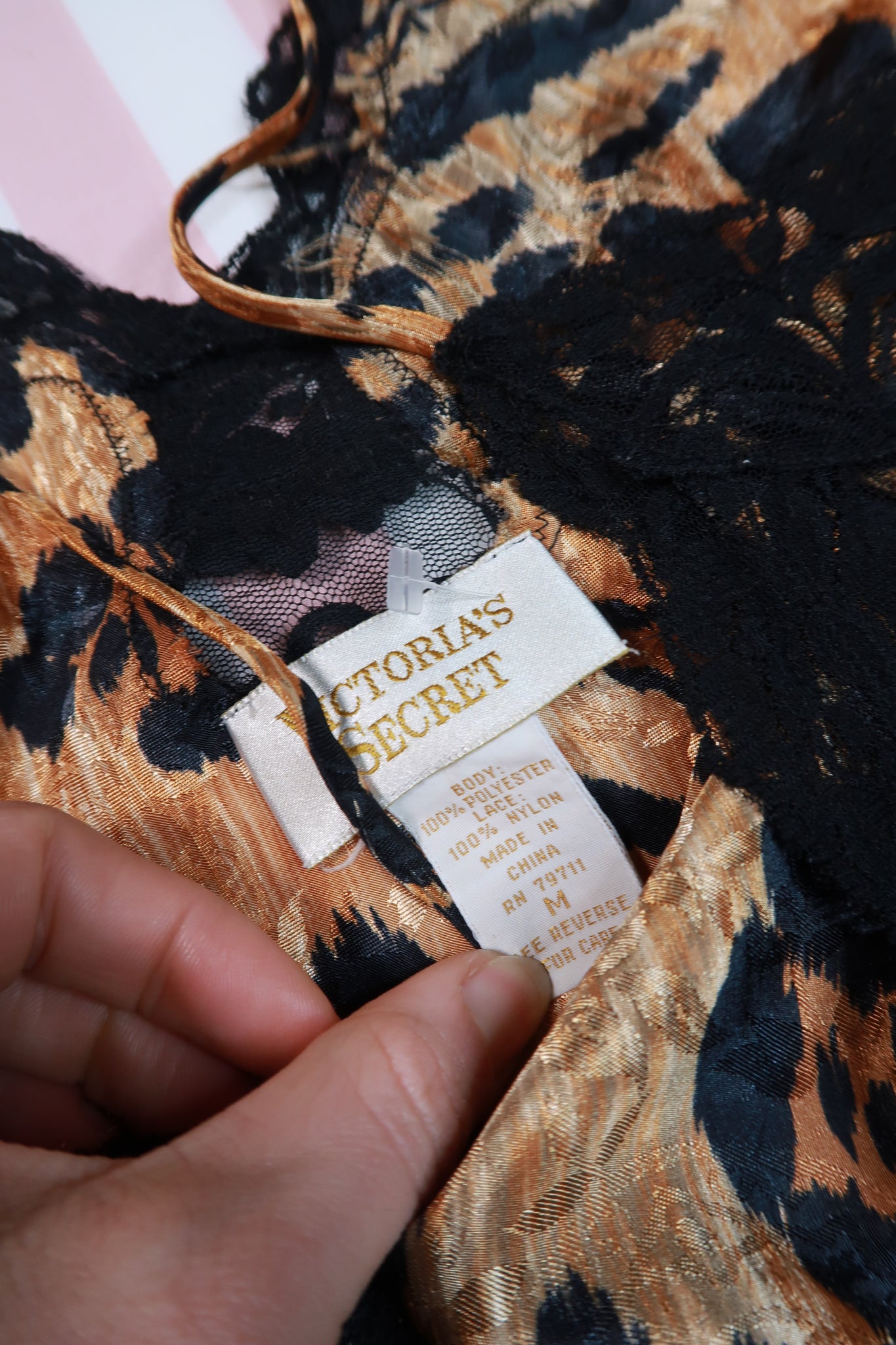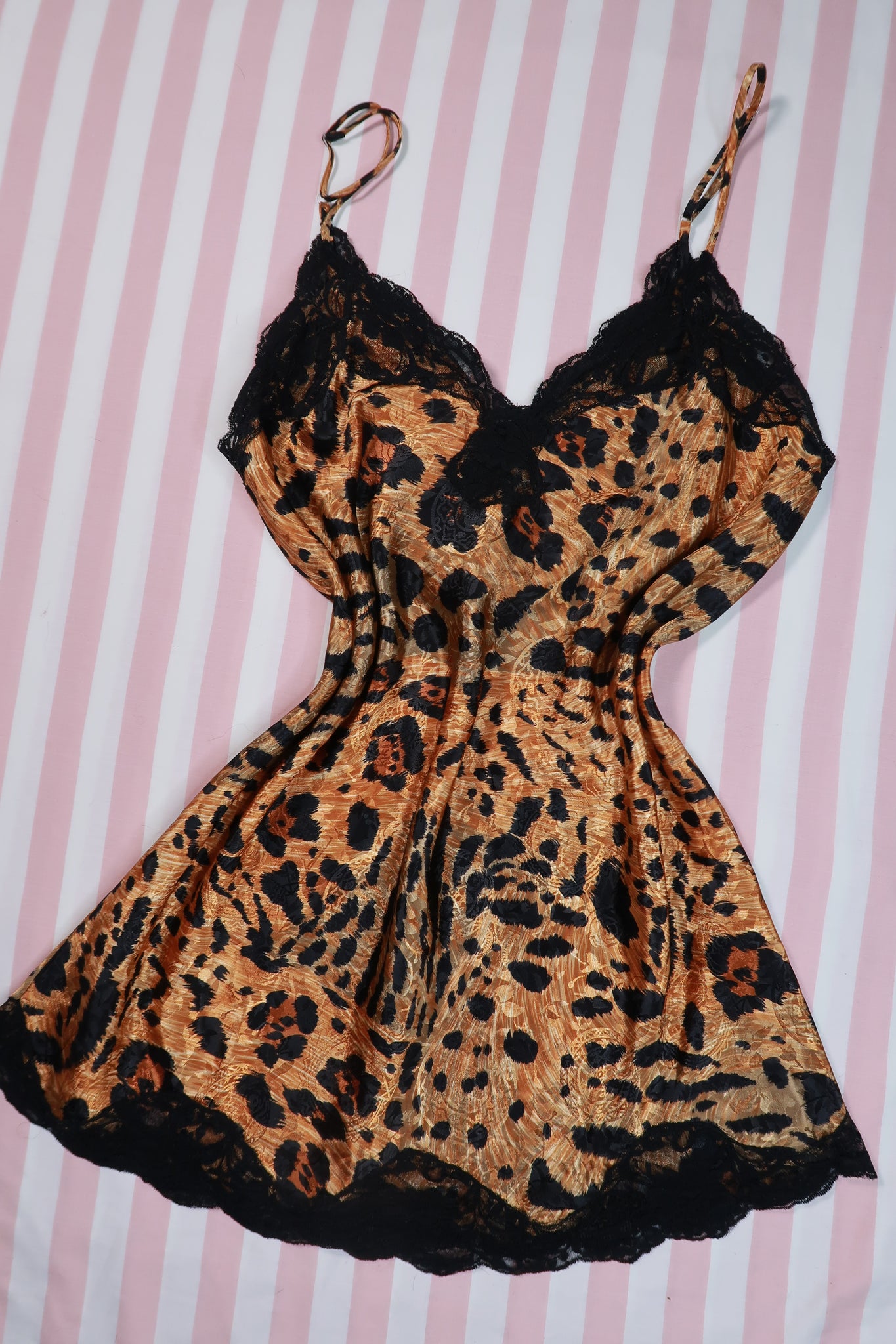 Bold vintage Gold Label Victoria’s Secret slip dress in a striking leopard print with black lace trim, designed in a classic lingerie-inspired silhouette. The silky, lightweight fabric features an allover animal print that creates high visual impact, while the scalloped black lace frames the deep V neckline and hem for dramatic contrast. A sheer lace inset at the bust adds texture and dimension, enhancing the romantic boudoir styling.
