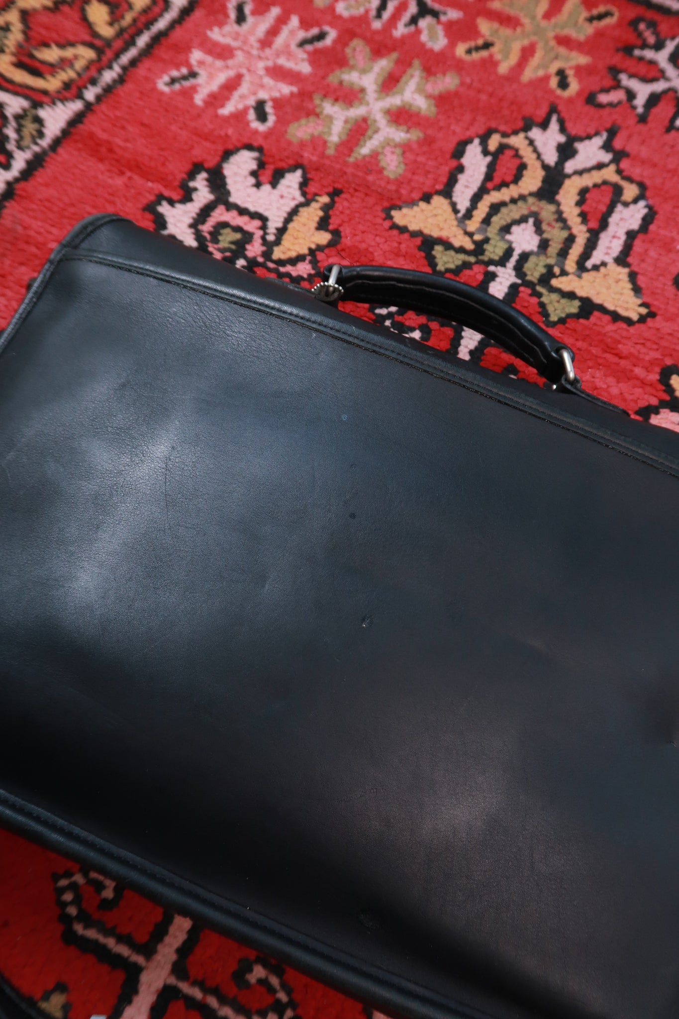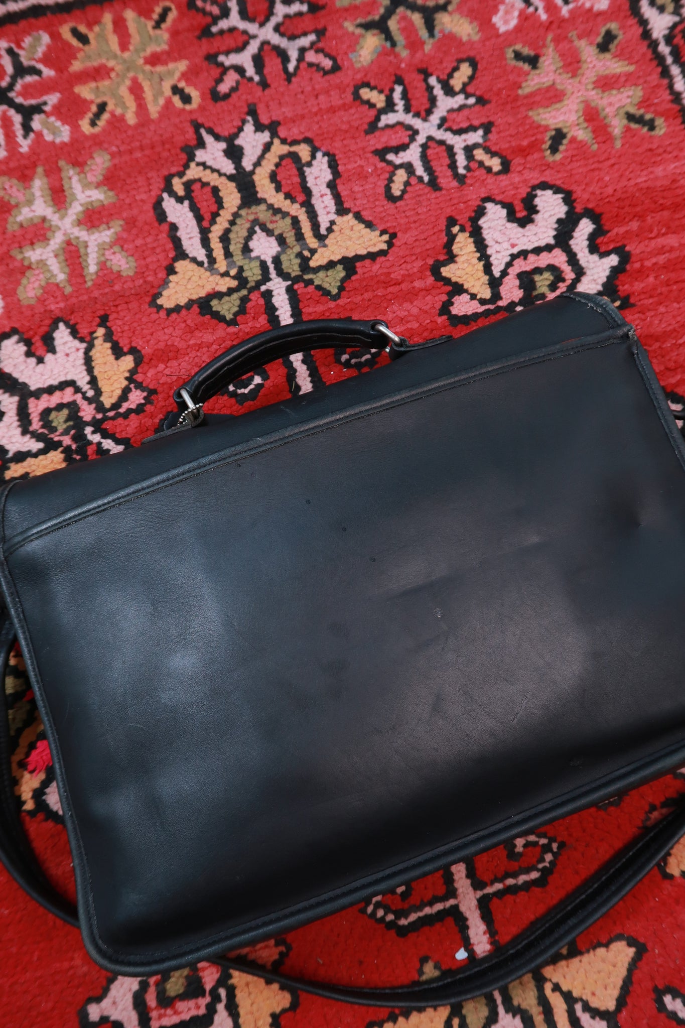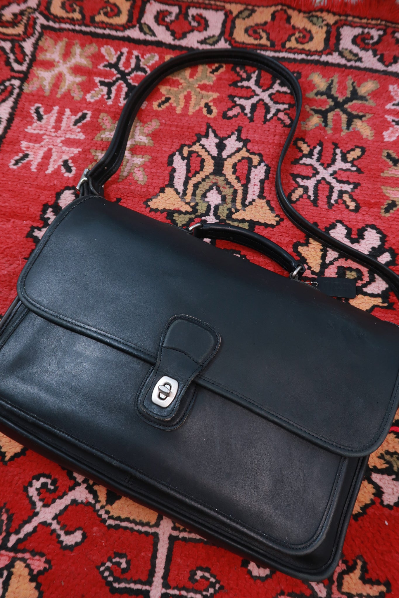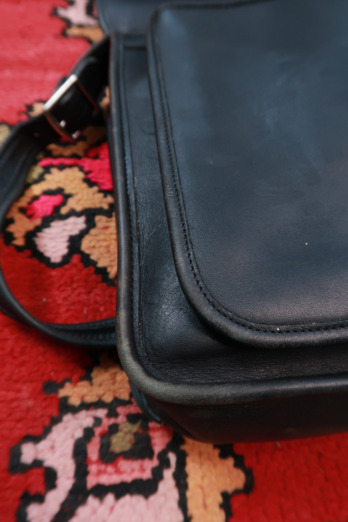 Authentic vintage Coach Metropolitan bag in classic black pebbled leather, style number 5180. This structured rectangular silhouette features a fold-over flap front with a center strap and turn-lock style closure, giving it that timeless, understated Coach look. Designed with a long adjustable shoulder strap for comfortable shoulder or crossbody wear. The leather has a smooth, broken-in finish with natural vintage character, making it ideal for everyday use while still feeling elevated and classic.