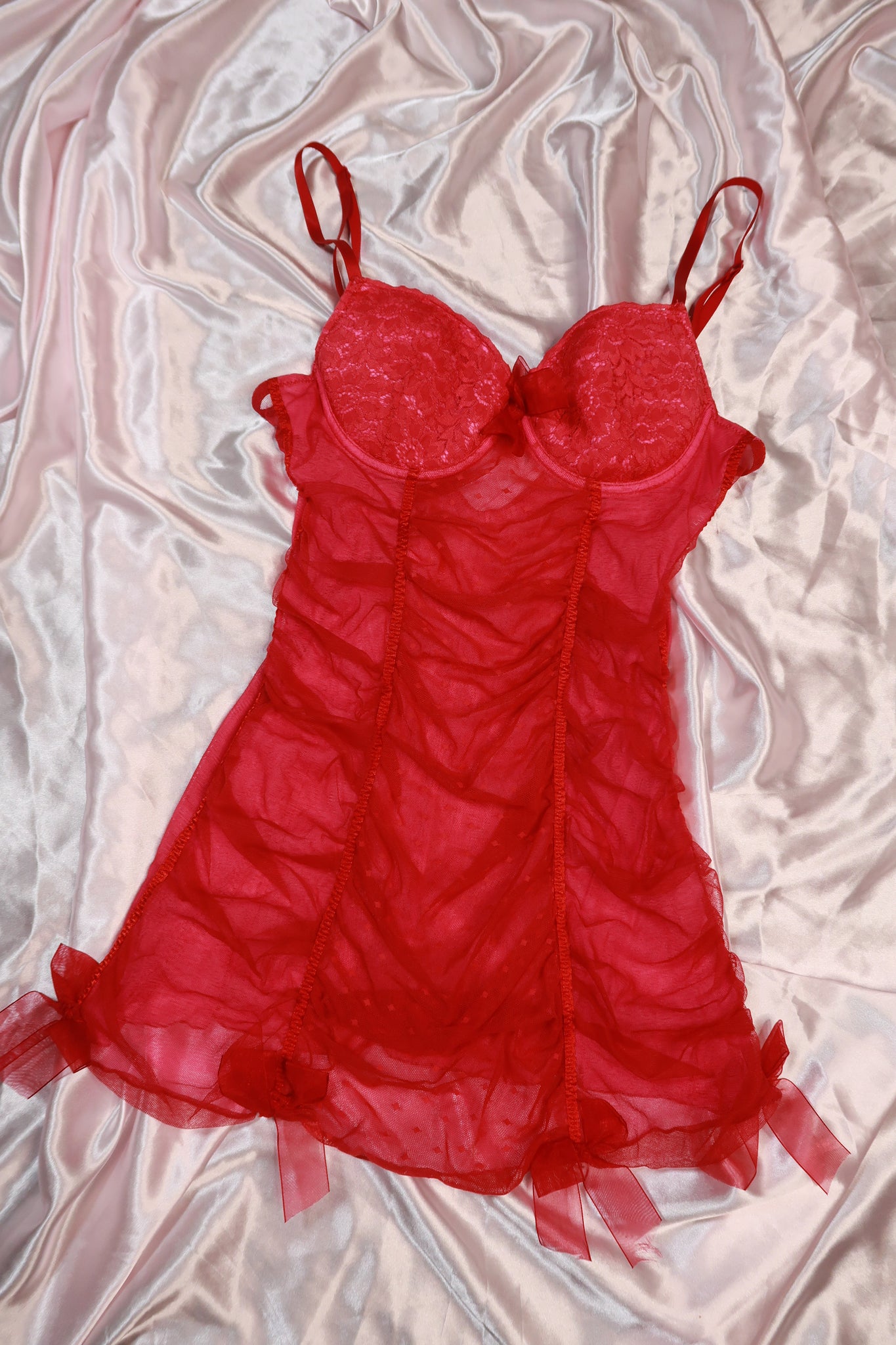 Sultry early-2000s lingerie camisole in vivid cherry red sheer mesh with molded lace cups and vertical contour seams that shape the torso. Semi-transparent fabric flows into a flouncy ruffled hem finished with tiny ribbon bow accents. Adjustable spaghetti straps and softly structured bust create a classic Y2K lingerie-as-outerwear silhouette — perfect layered or worn as a statement going-out top.
