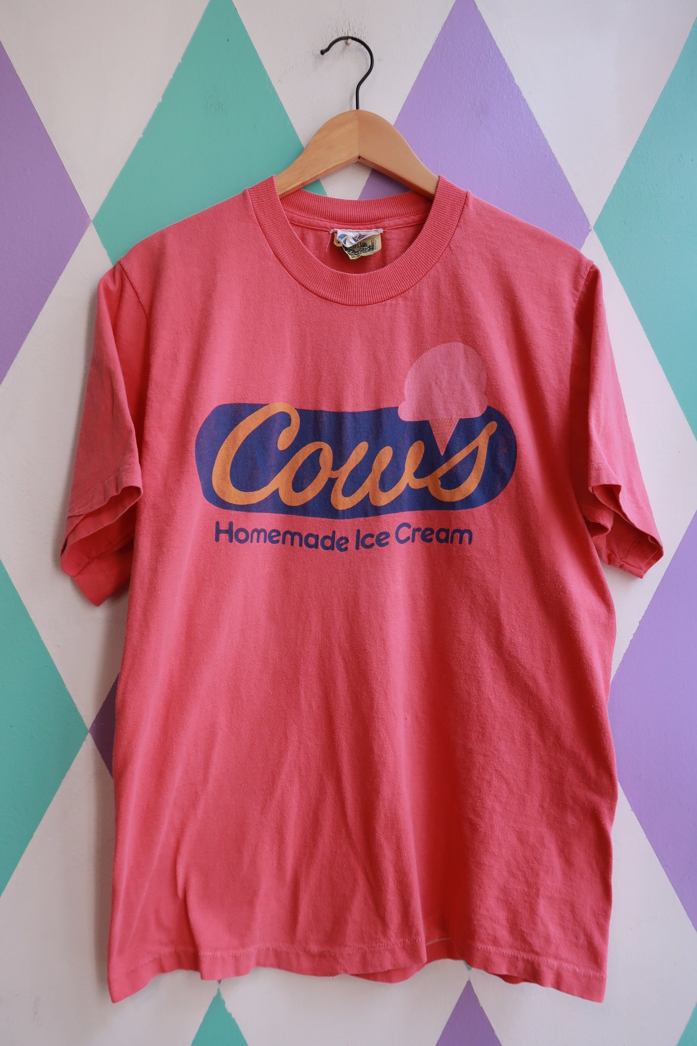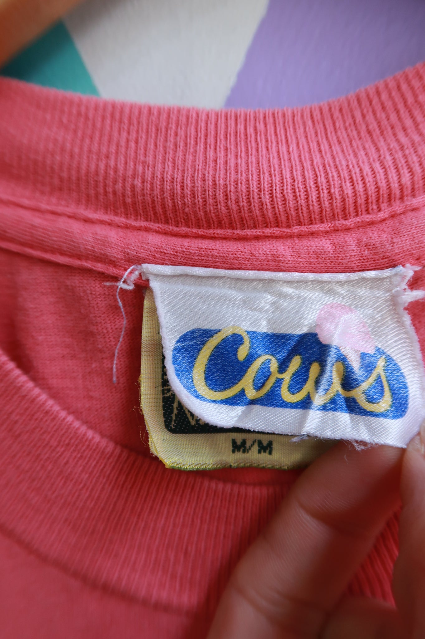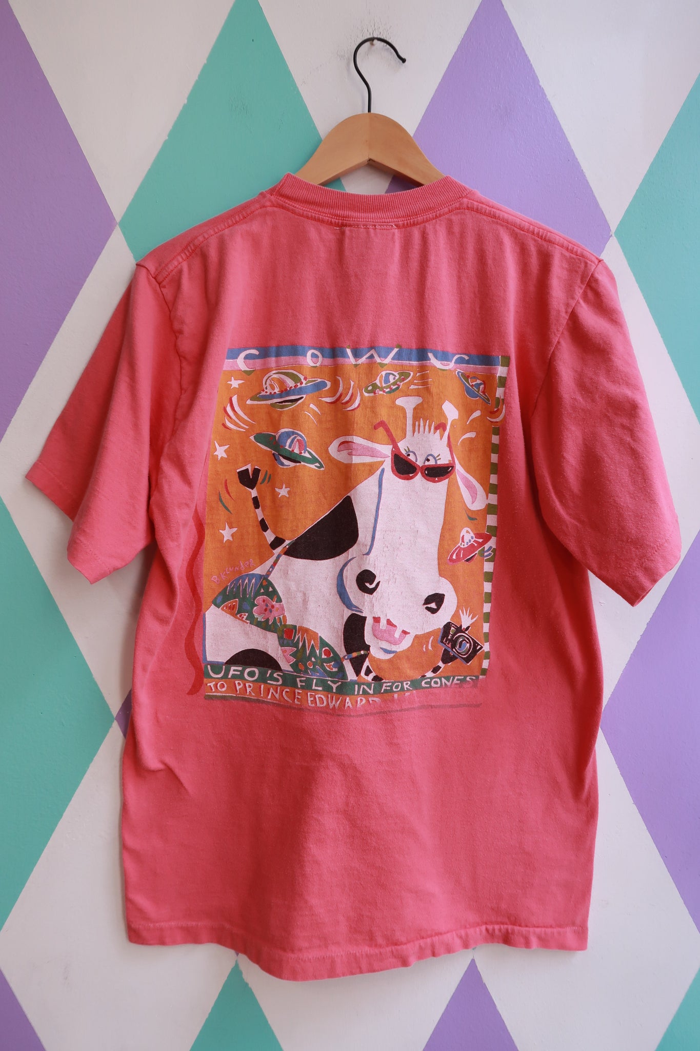 Authentic 1990s Cow’s Ice Cream souvenir tee with single stitch hem in a soft, sun-faded coral pink. The front features the classic Cow’s Homemade Ice Cream logo with an ice cream cone graphic, while the back steals the show with a bold, whimsical cartoon cow illustration surrounded by playful UFO and space-themed details—an iconic, quirky design Cow’s is known for. Relaxed vintage fit with a classic crew neckline and short sleeves. Perfect worn-in feel that only true 90s tees have, ideal for casual styling, layering, or collectors of nostalgic food and travel graphics.