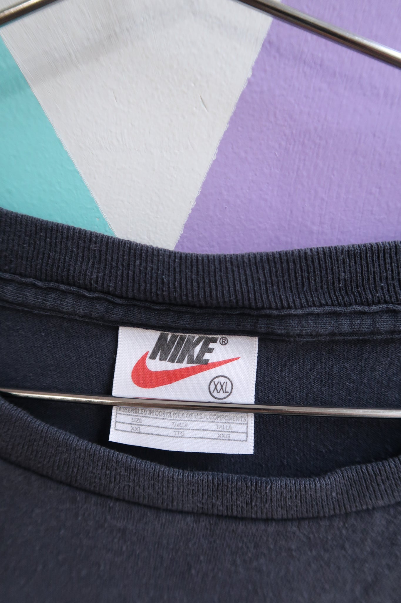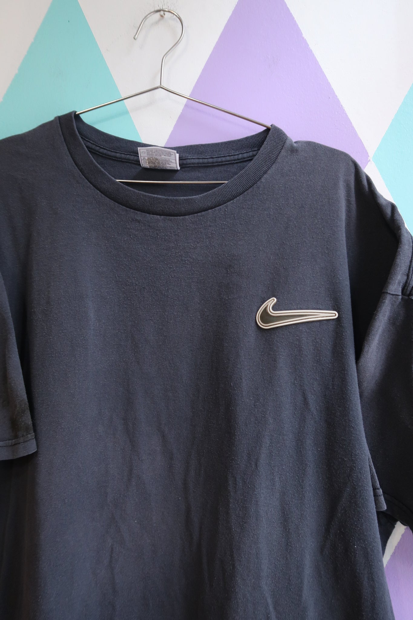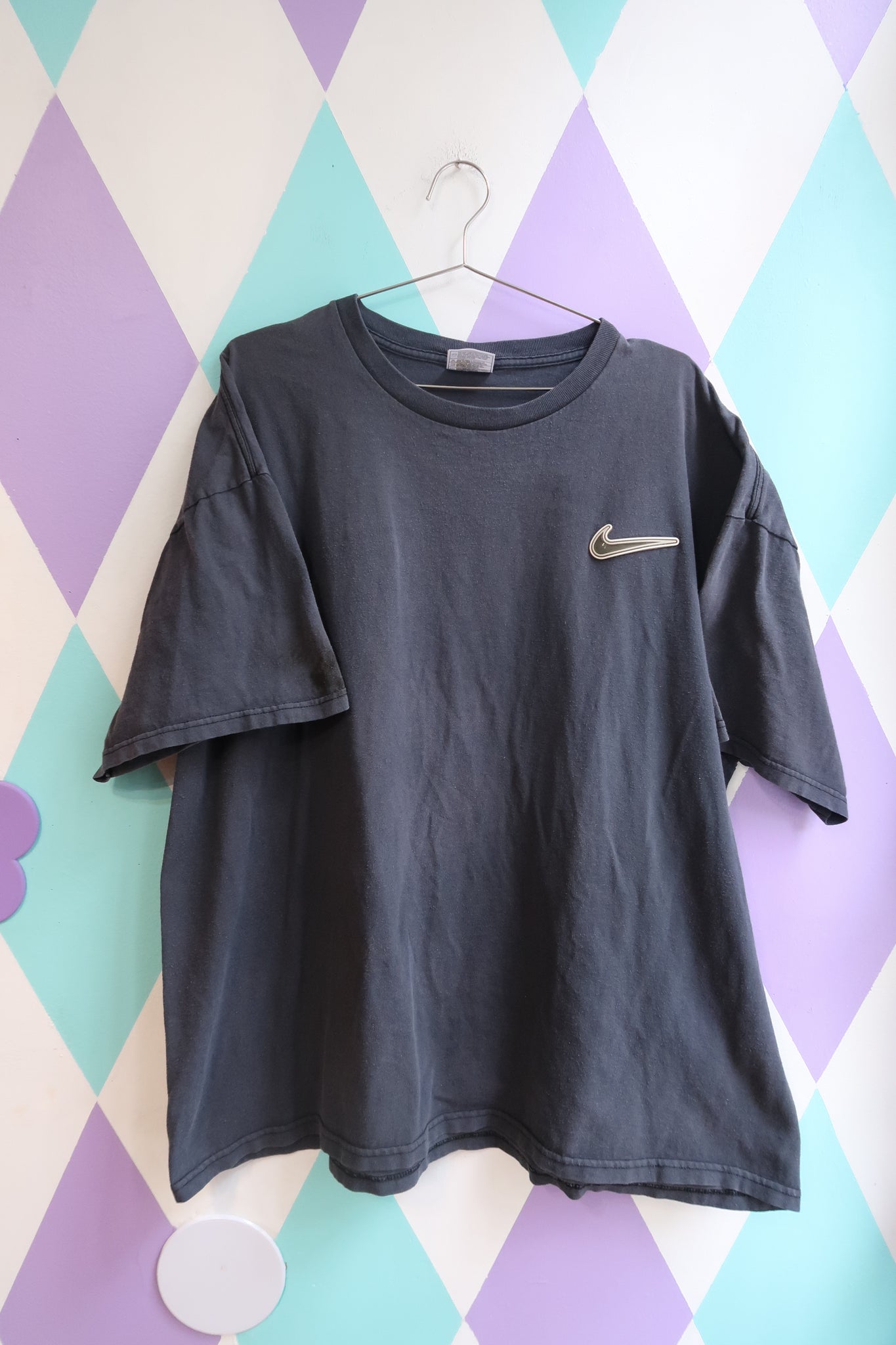Authentic vintage 2000s Nike tee in a faded charcoal-black tone with a naturally worn, broken-in look that only comes from age and wear. This shirt features a classic crew neckline, short sleeves, and a relaxed early-2000s fit that drapes effortlessly through the body.