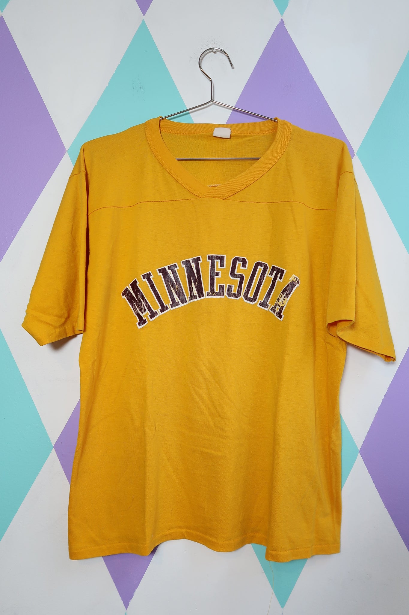 This vintage Minnesota T-shirt channels classic collegiate style with its bold arched “MINNESOTA” graphic printed across the chest in worn-in navy lettering. Crafted from soft, breathable cotton, it features a golden yellow hue that gives off that perfectly faded, sun-washed vintage tone.