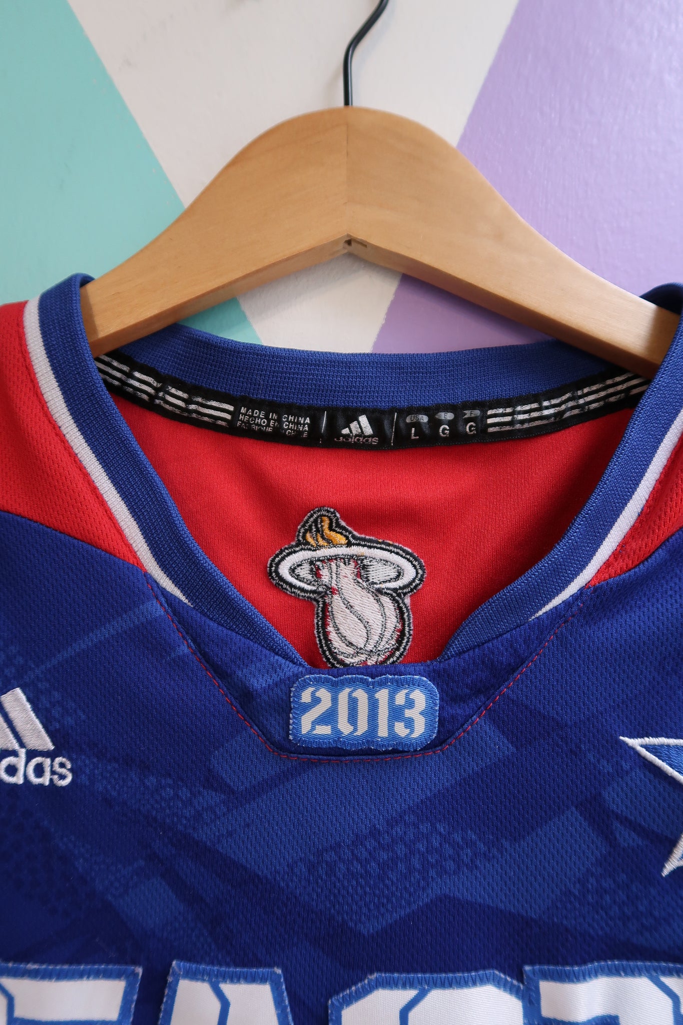 Official 2013 NBA All-Star Game Eastern Conference jersey by Adidas, featuring LeBron James #6. Designed in bold royal blue with red and white star detailing, this authentic sleeveless jersey showcases embroidered team graphics, NBA All-Star 2013 patch, and the Miami Heat logo on the upper back.