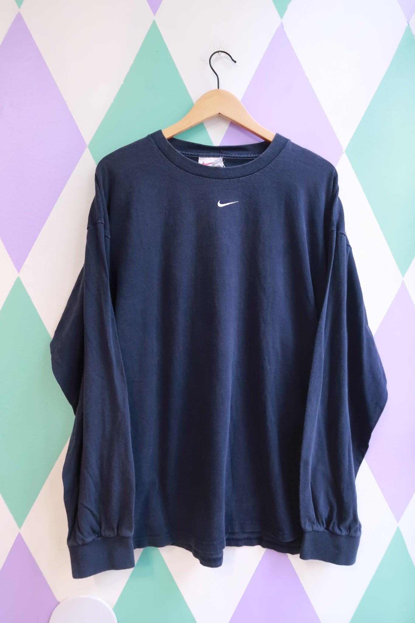 Vintage 2000s Nike long sleeve shirt in a deep navy blue featuring a small, cleanly embroidered white swoosh centered at the chest. The minimalist logo placement gives the piece a quiet, understated look that feels true to early 2000s Nike essentials. Designed in a classic crewneck silhouette with long sleeves, ribbed cuffs, and a relaxed, slightly boxy fit that reflects vintage athletic proportions.
