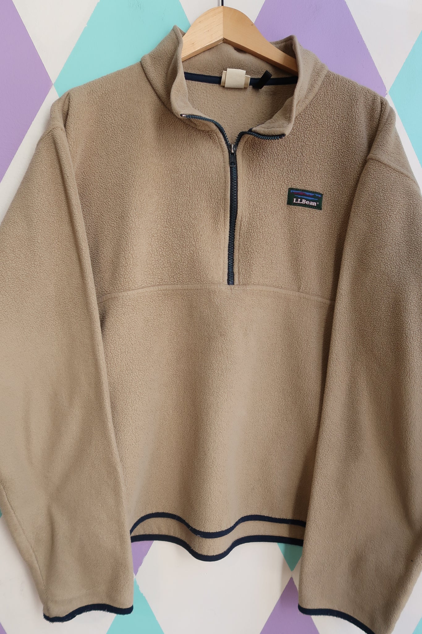 This vintage 90s L.L. Bean quarter zip fleece is a cozy classic that defines effortless outdoor style. The warm tan fleece body features soft, plush texture with navy trim detailing along the collar, hem, and cuffs for a subtle contrast. The zip-up high collar and embroidered L.L. Bean logo patch at the chest complete the signature look of this timeless cold-weather staple.