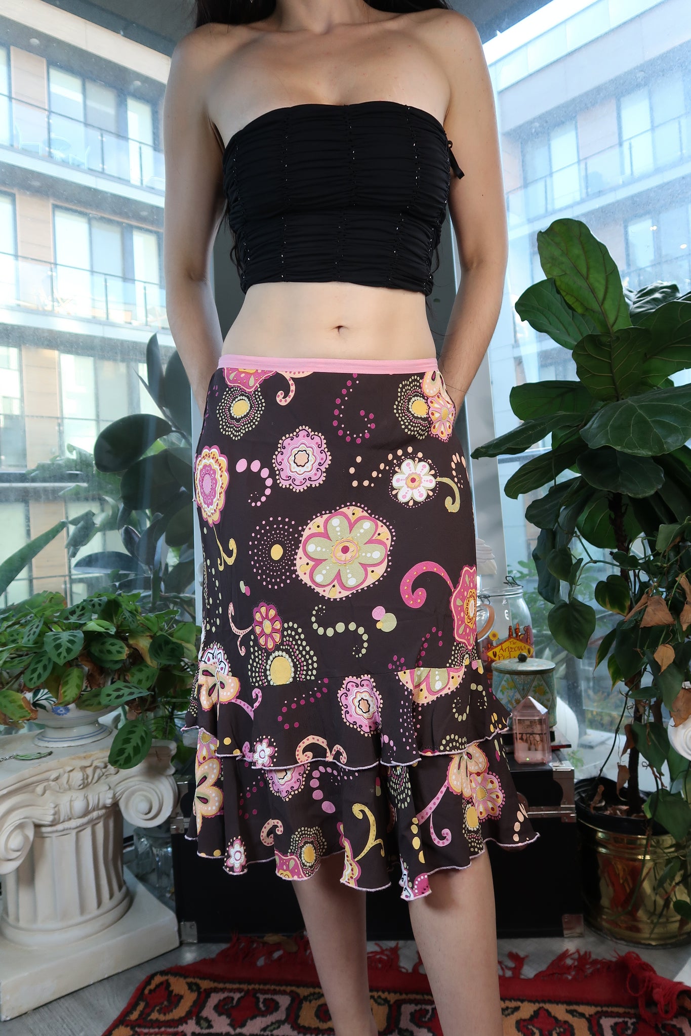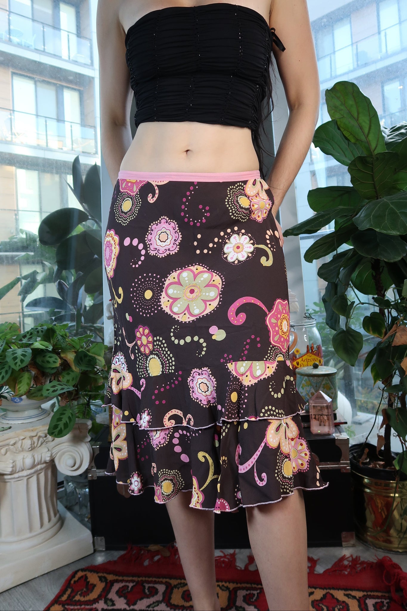 This paisley skirt from the 2000s features an elastic band waist for comfortable wear. Enjoy the perfect balance of style and comfort with this stunning floral skirt.