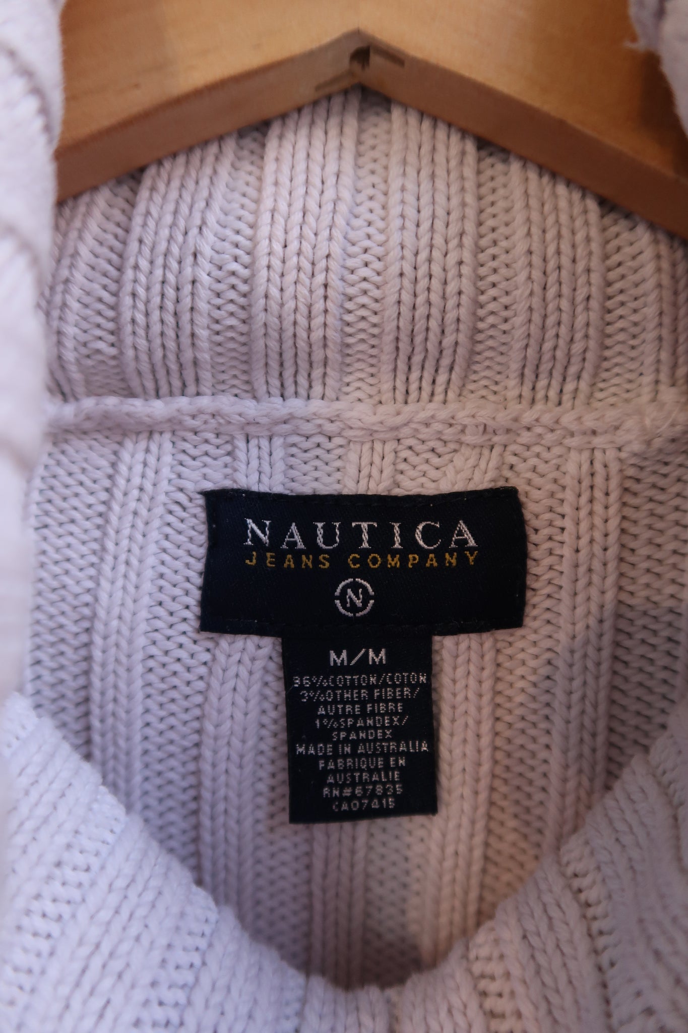 This 2000s Nautica turtleneck sweater features a chunky ribbed knit and a soft off-white hue, offering that clean, preppy look the brand is known for. The fold-over turtleneck, straight hem, and subtle Nautica sleeve logo patch make it a versatile and timeless piece for cool-weather styling.