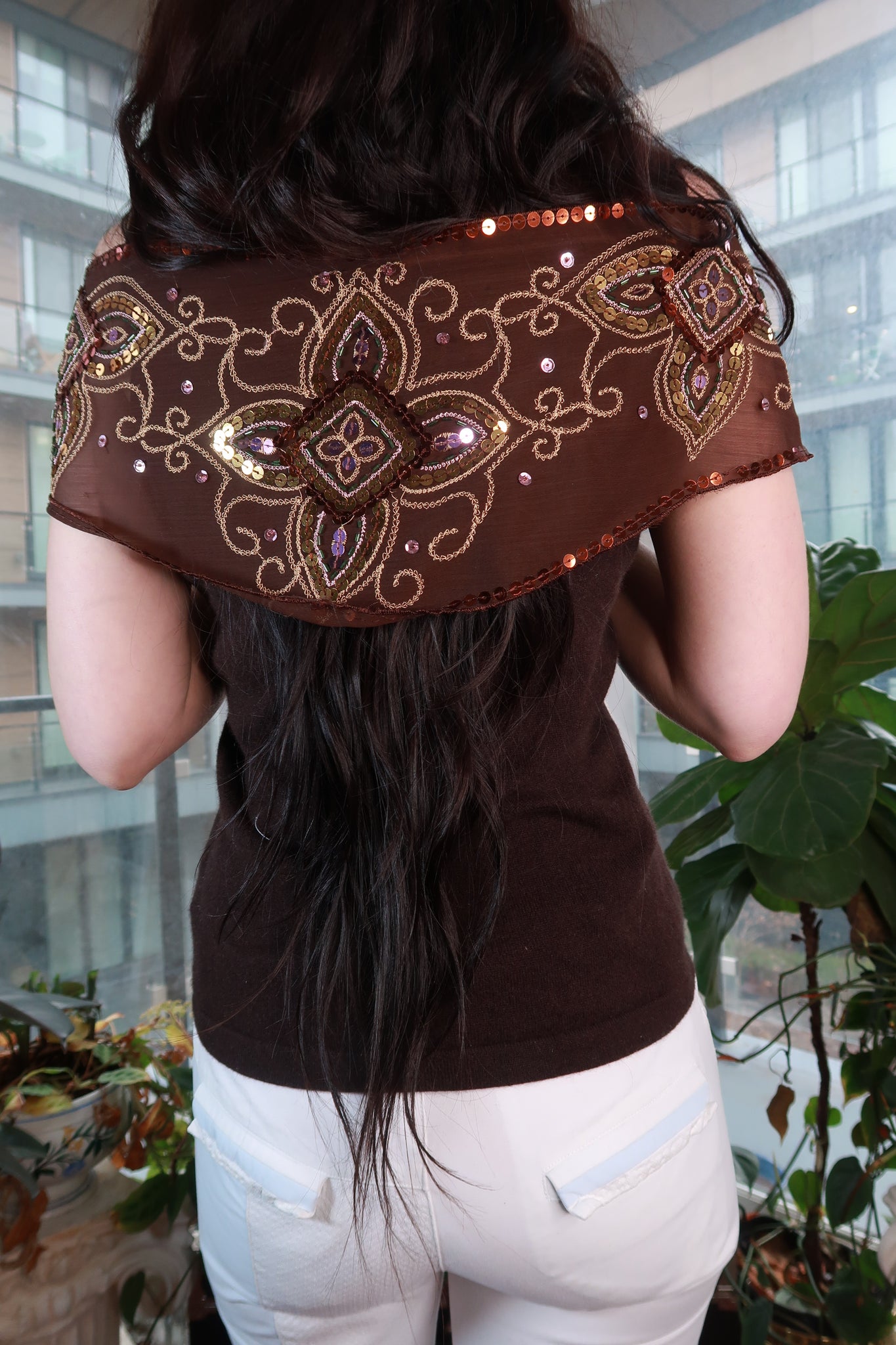 Sheer brown vintage scarf with beaded sequins and embroidery, 2000s Y2K style, styled as a statement wrap by Elektra Vintage.