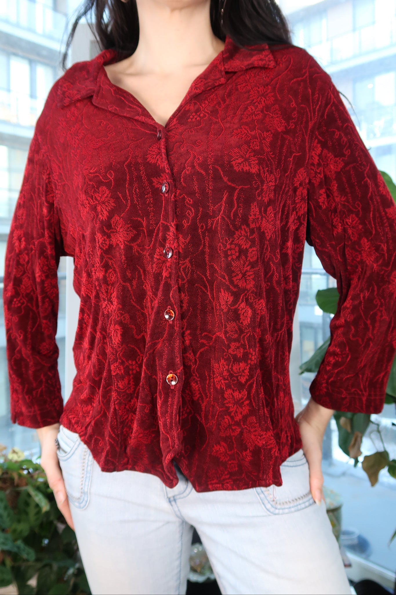 Striking vintage 1990s slinky red floral top with a rich, dimensional surface and fluid drape. This piece features an allover tonal floral pattern with a softly textured, slightly sheer look that catches the light beautifully. Designed with a collared neckline, button-front closure, and long sleeves, the silhouette skims the body in a way that’s effortlessly flattering and very true to 90s minimalist styling.