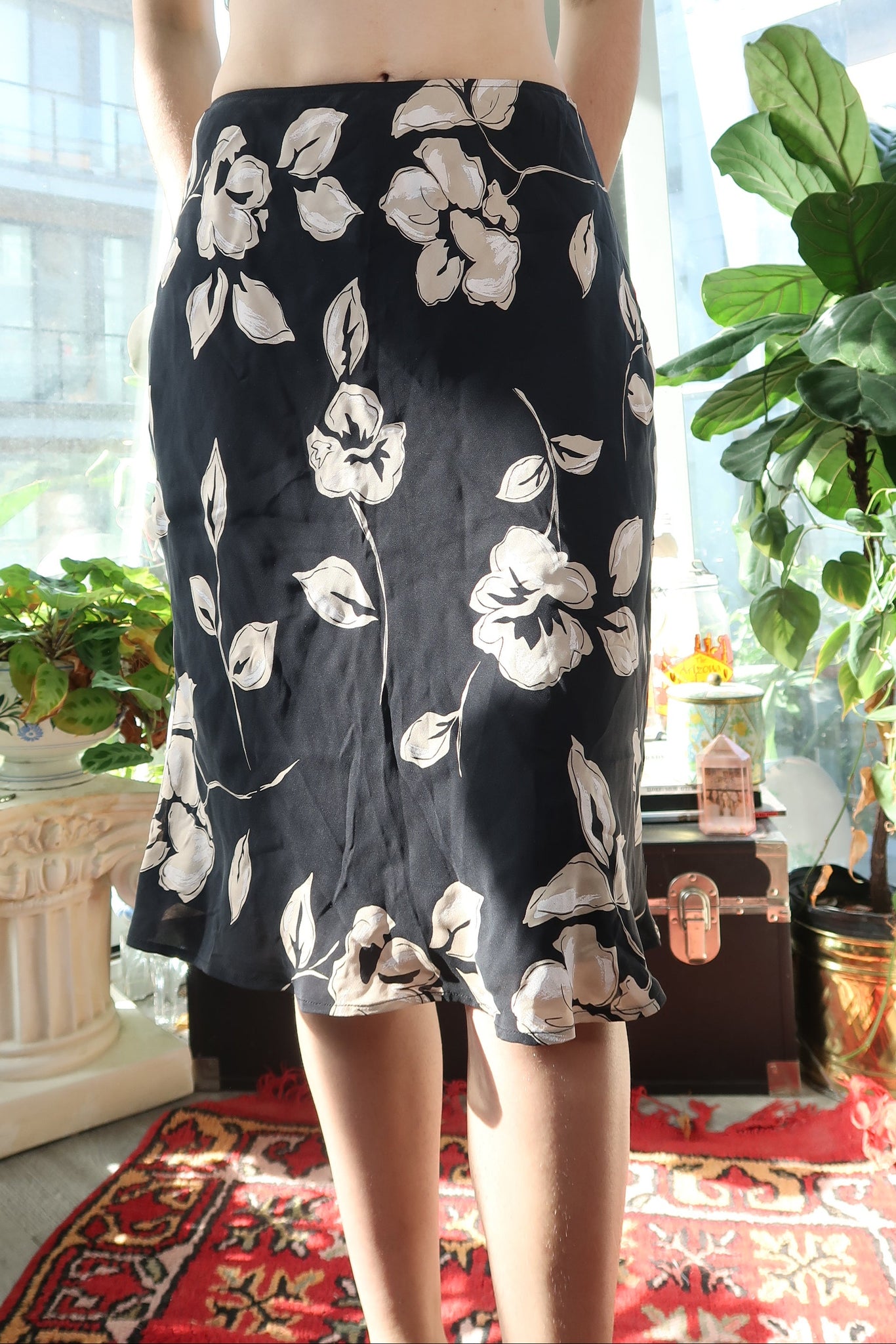 A beautiful vintage 100% silk skirt featuring an elegant black base with painterly cream-toned floral prints. The lightweight silk drapes effortlessly, giving the skirt a soft, fluid movement that feels luxe and timeless.