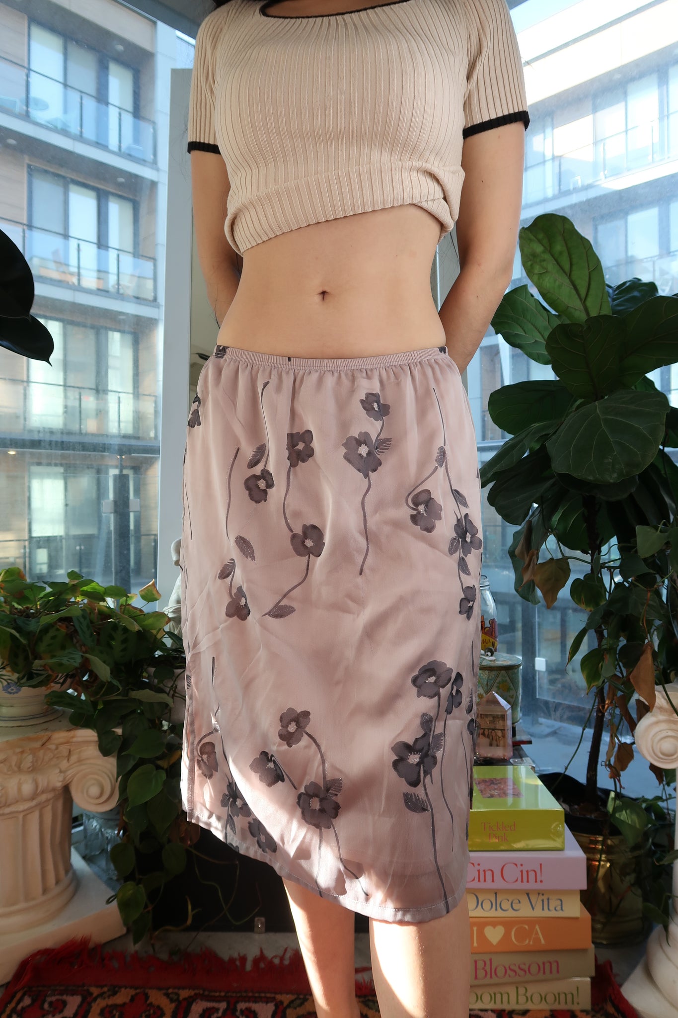 This vintage Y2K midi skirt features a sheer grey overlay with an allover dark floral print, creating a soft, muted contrast against the semi-transparent base. The overlay has a lightweight, airy drape that moves fluidly, giving the skirt a delicate, romantic look without stiffness or structure.