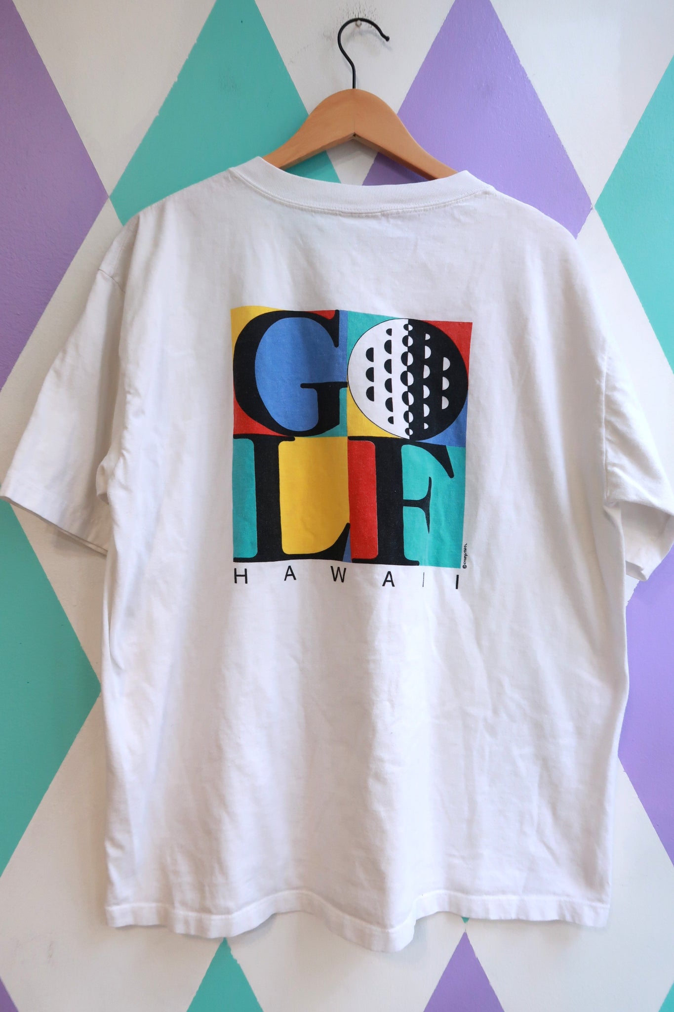 Vintage 1990s Hawaii graphic T-shirt featuring a bold, colorful “GOLF” design with a small chest graphic on the front and a large statement print across the back. The artwork uses bright blocks of teal, blue, yellow, red, and black with graphic patterns that feel distinctly late-90s, blending sporty golf culture with playful, resort-style design. The word “Hawaii” appears beneath the back graphic, grounding the shirt in classic island souvenir style.