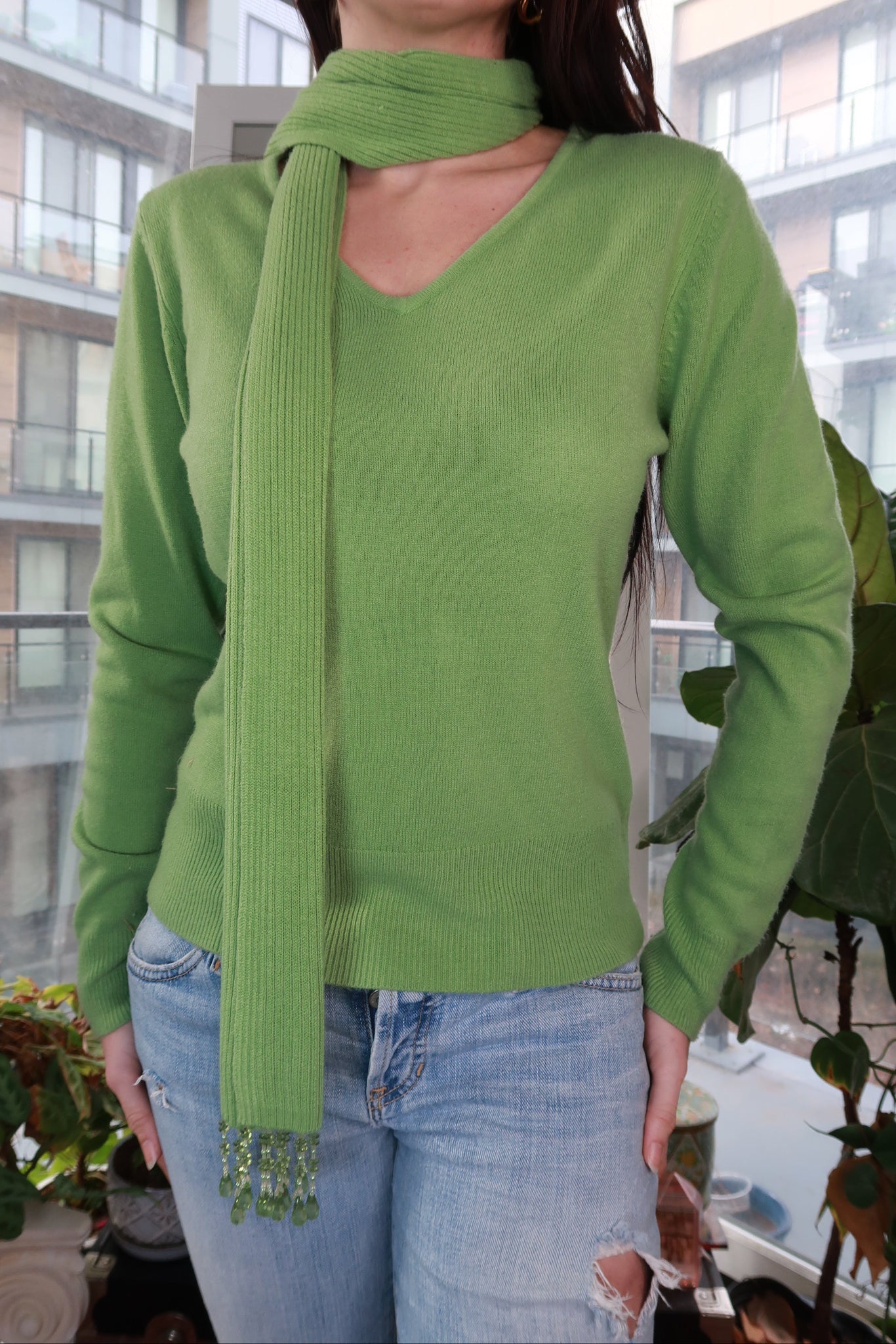 Bright spring green lightweight knit sweater featuring a clean fitted silhouette and coordinating detachable knit scarf. Soft fine-gauge knit with subtle vertical texture, long sleeves, and a classic crew neckline. The matching scarf has ribbed detailing with beaded fringe ends, giving it that unmistakable early-2000s layered look — wear together for full Y2K styling or separately as a versatile wardrobe piece.