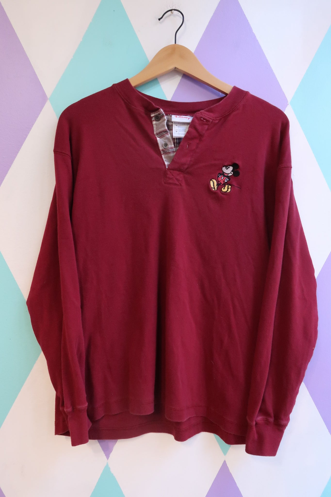 Authentic vintage 2000s Disney long sleeve henley in a rich deep burgundy / wine red tone, featuring a small embroidered Mickey Mouse graphic on the left chest. The embroidery shows classic Mickey in his iconic red shorts and yellow shoes, adding a subtle pop of color against the solid base.