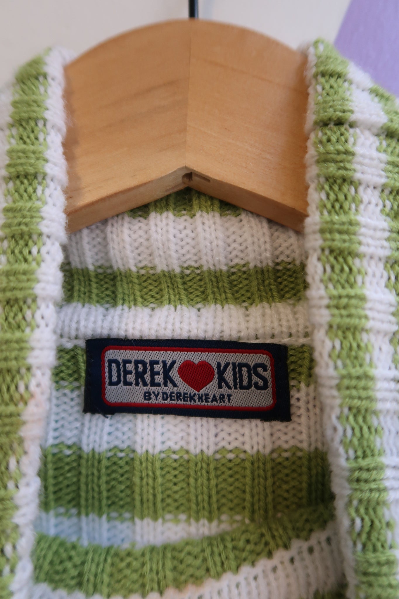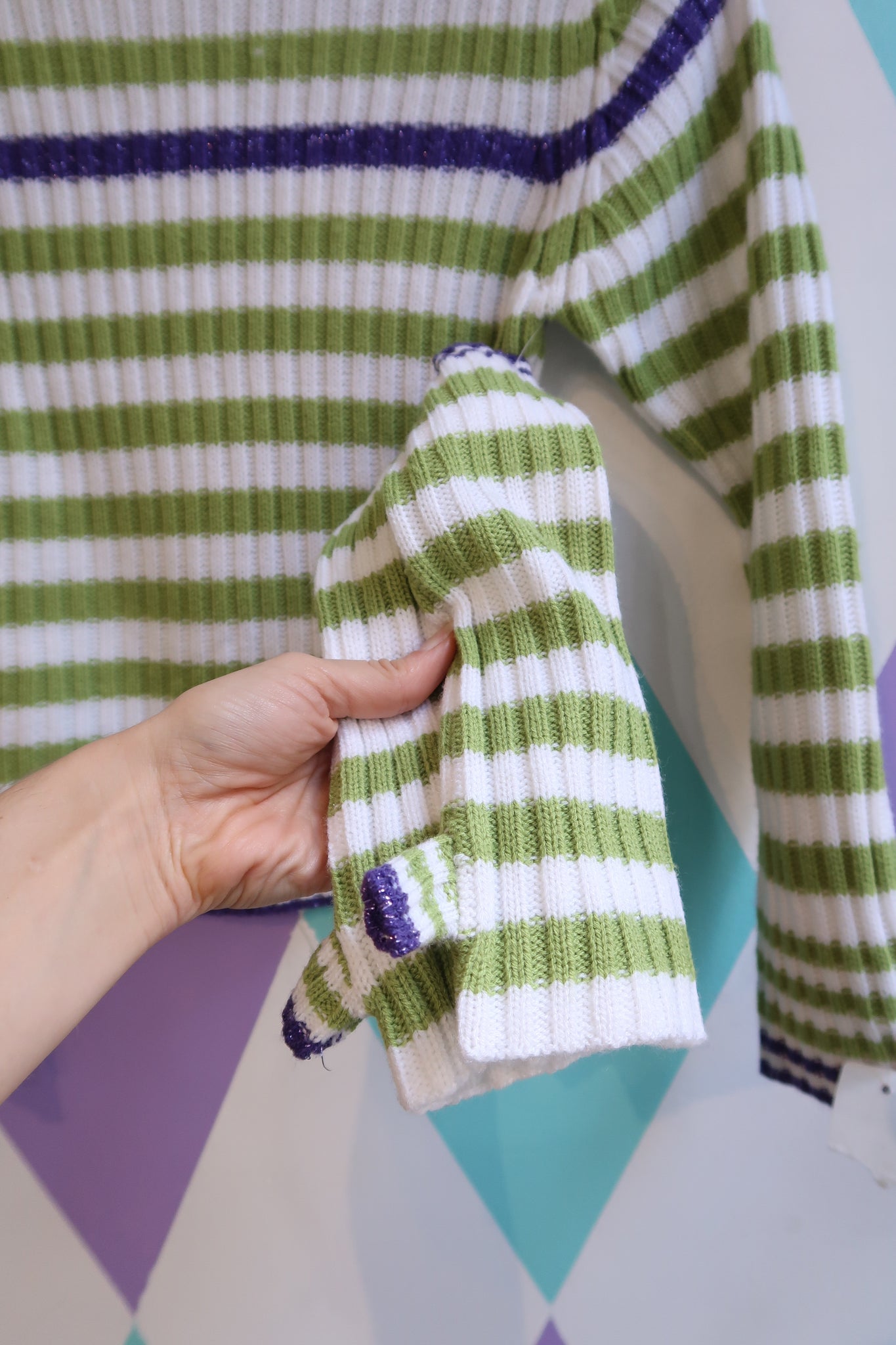 This new-with-tags Y2K 2000s knit sweater set is the ultimate early-2000s statement piece. Designed in a ribbed stretch knit, it features lime green and white horizontal stripes with deep purple trim along the mock turtleneck, cuffs, and hem. The matching fingerless gloves complete the coordinated look, giving it that distinct mall-era aesthetic.