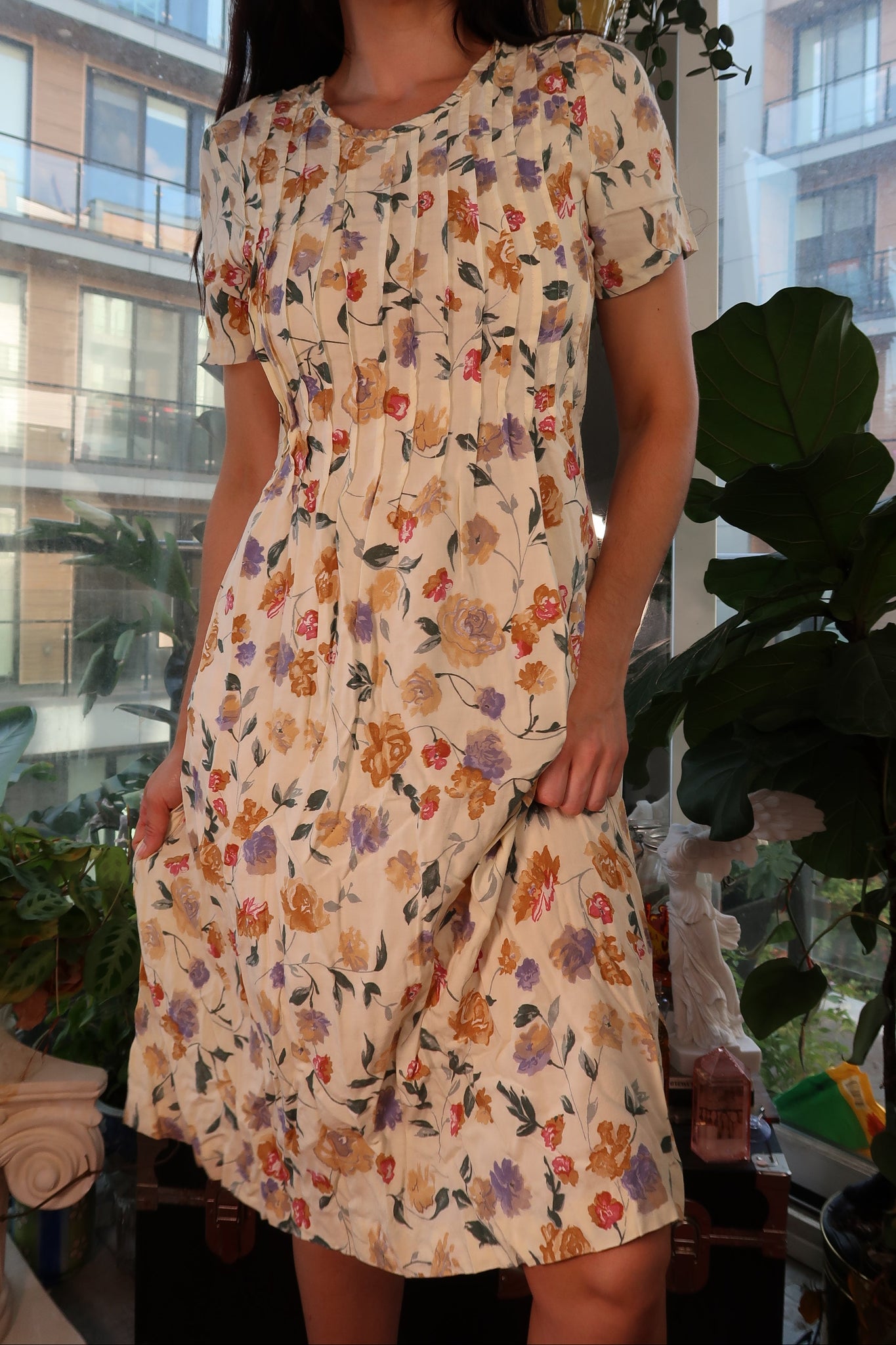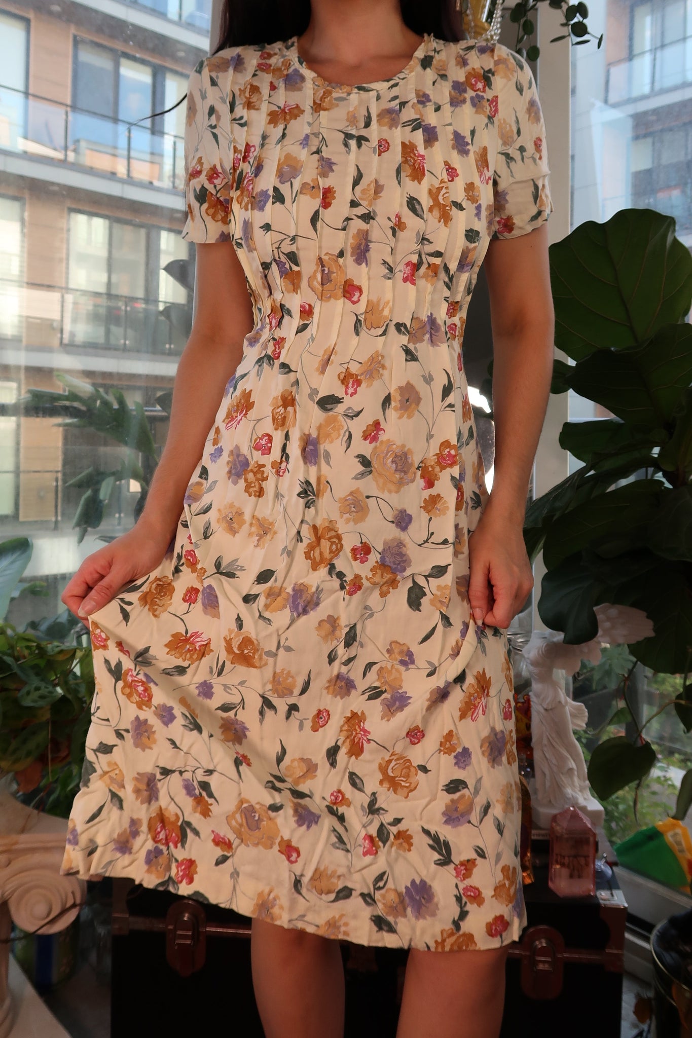 Vintage 1990s floral midi dress in a soft cream base with an allover print of yellow, lavender, and red blossoms. Features delicate pintuck pleating down the bodice for a feminine, structured shape and subtle ruching along the hemline that gives the skirt a gentle drape and movement.