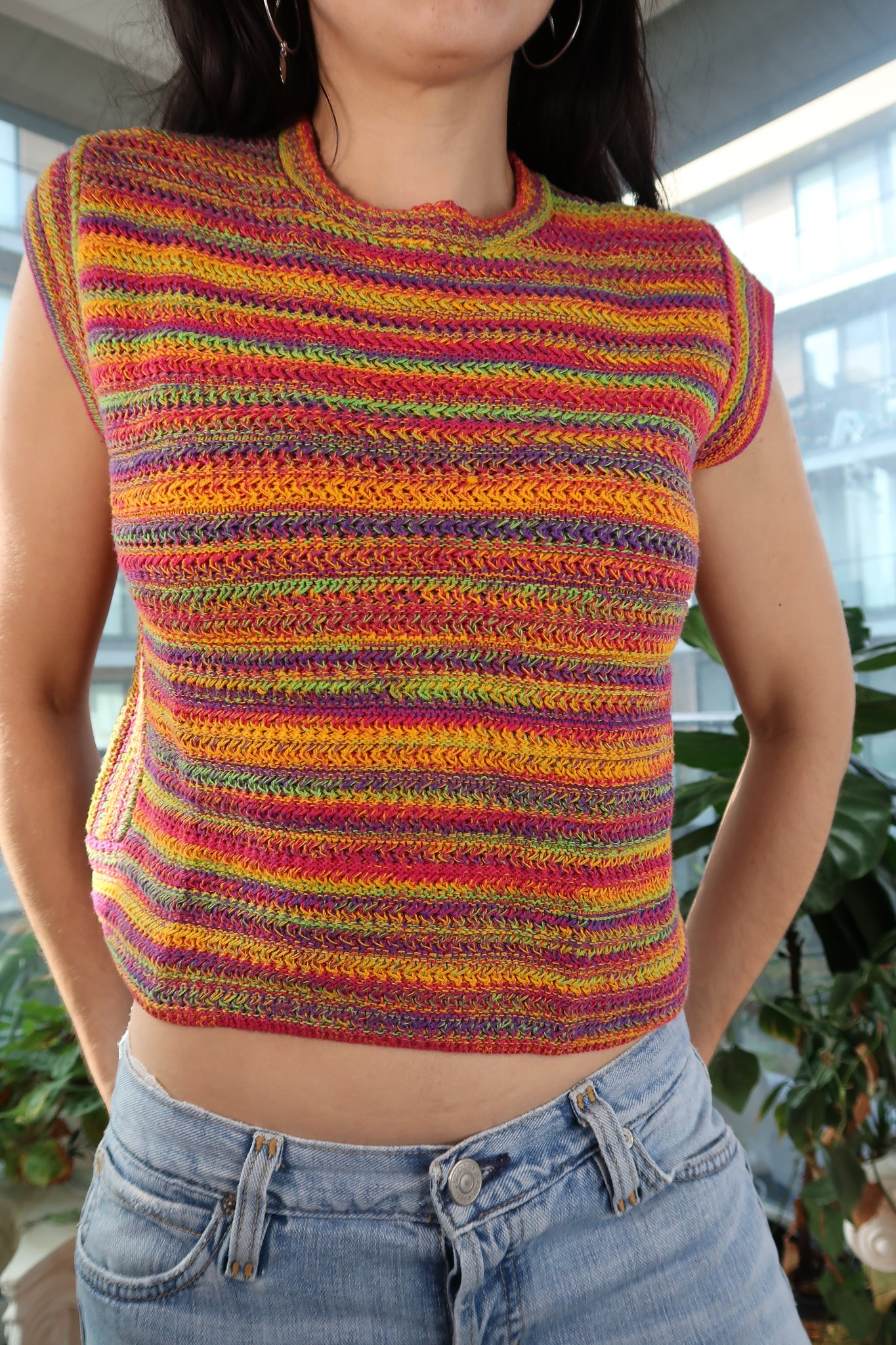 A vibrant and playful vintage 2000s multicolor crochet-knit top featuring bold horizontal stripes in orange, pink, purple, green, and yellow. This fitted cap-sleeve silhouette has a slightly cropped cut and a soft, lightweight knit texture that hugs without feeling heavy. The intricate crochet stitch pattern gives it dimension and a handmade feel, perfect for adding a pop of color to jeans, minis, or layered summer outfits. A true Y2K standout with festival-ready vibes and iconic early-2000s energy.