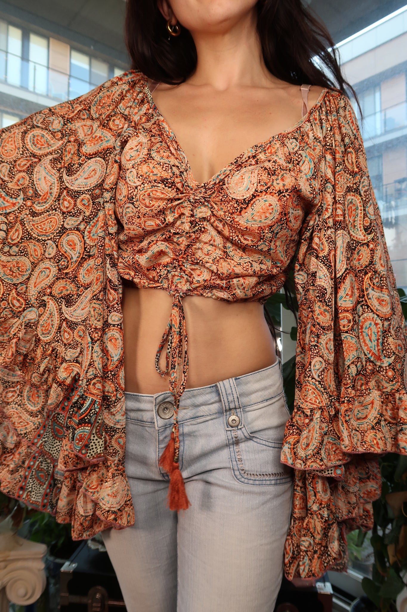 This vintage Y2K boho crop top is a statement piece full of movement, texture, and 2000s flair. Designed in a rich paisley print blending shades of rust, teal, and cream, it features dramatic flared bell sleeves with layered ruffles and a ruched drawstring front that ties at the waist with tasseled cords. The lightweight, flowy fabric gives it an effortless drape, while the deep V-neckline adds a hint of romantic allure.