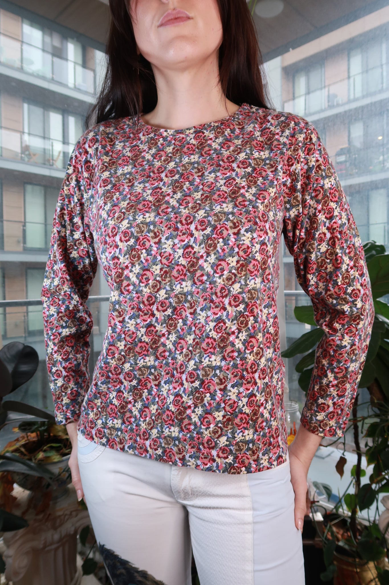 Vintage 2000s long sleeve top featuring an all-over micro floral print in shades of red, dusty rose, muted blue, brown, and cream. This piece has a classic Y2K fitted silhouette with a simple crew neckline and soft lightweight fabric that drapes comfortably while maintaining a flattering shape. The dense floral pattern creates a tapestry-like look, giving the top a slightly romantic vintage feel while still fitting perfectly into early-2000s casual styling.