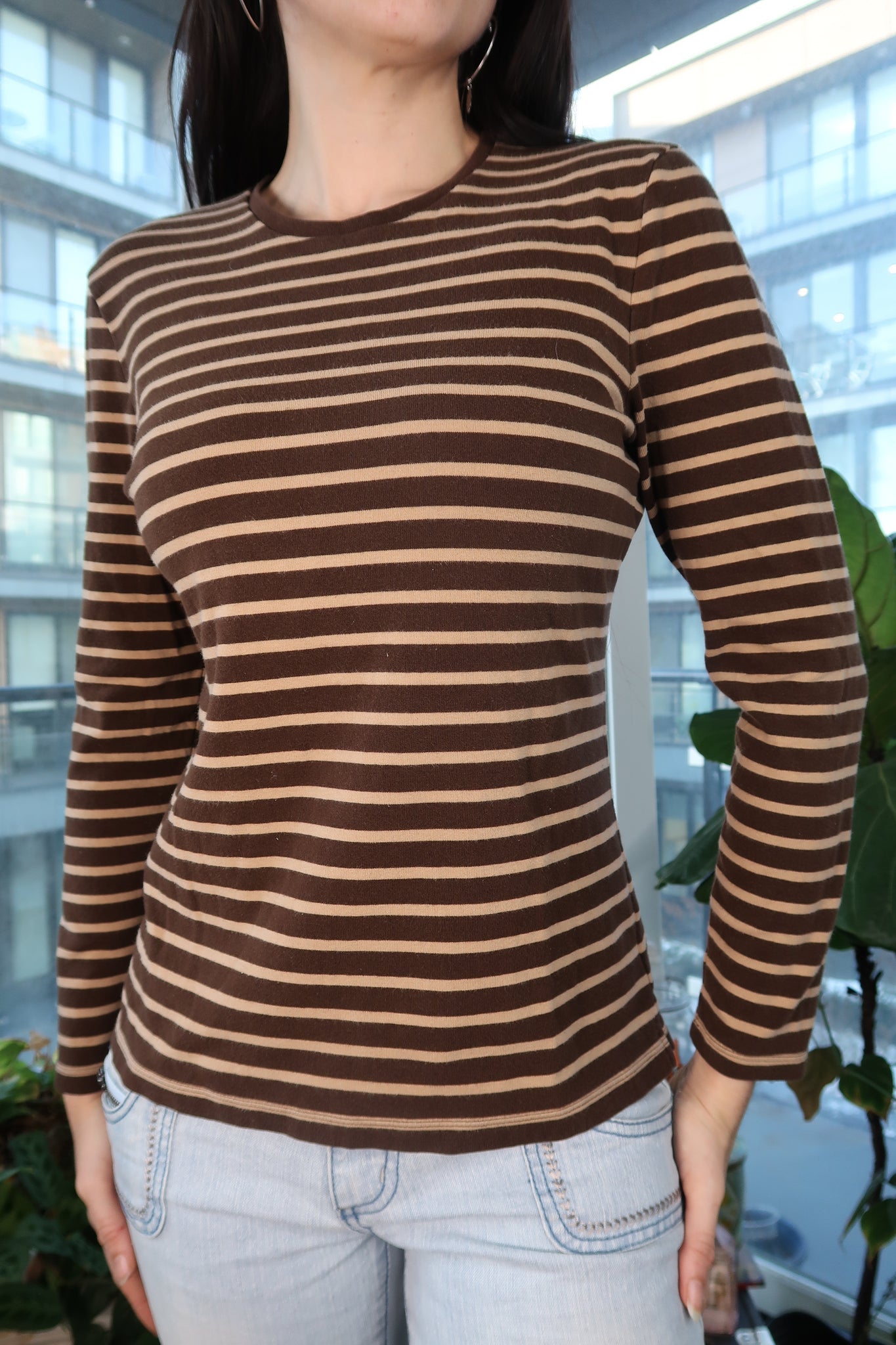 Classic vintage 2000s Ralph Lauren top featuring timeless brown and tan horizontal stripes in a sleek, body-skimming silhouette. This piece is designed with a crew neckline, long sleeves. The slim fit and clean stripe pattern are signature of early-2000s Ralph Lauren casualwear—polished, understated, and effortlessly flattering.