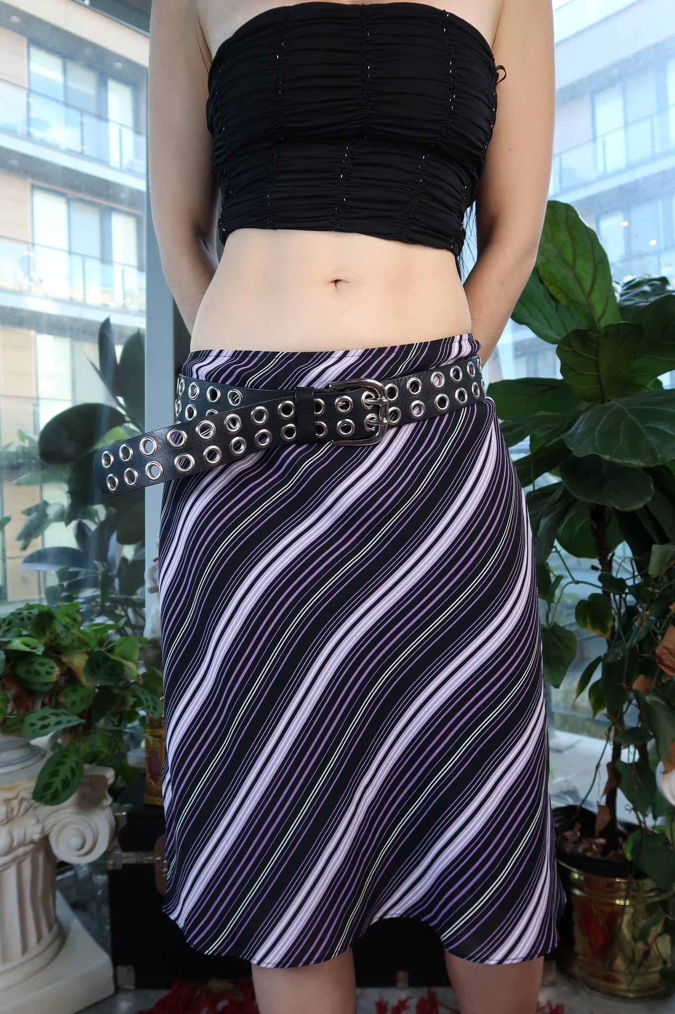 This vintage 2000s midi skirt features a striking purple, black, and white diagonal bias stripe pattern that creates a sleek, elongating visual effect. The fluid midi length and clean, body-skimming silhouette deliver that minimalist early-2000s aesthetic that works effortlessly for both casual and elevated styling.