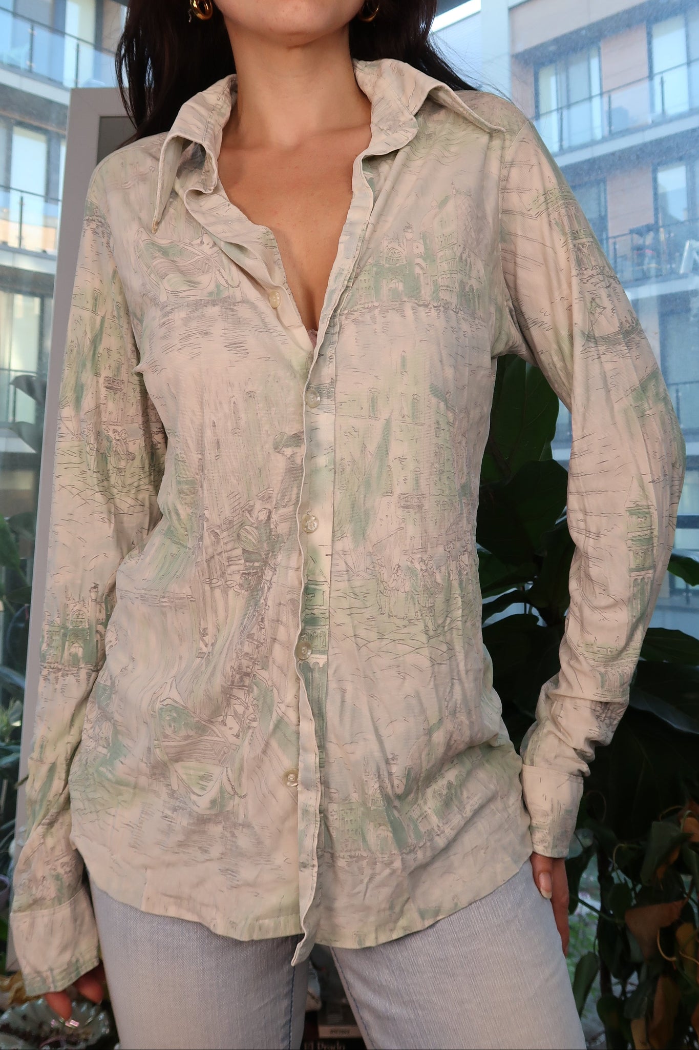 This vintage 70s button-down blouse features a dreamy Venice canal Italian cityscape print in soft shades of sage green and beige. Crafted from a lightweight woven fabric, it drapes effortlessly with a relaxed silhouette and classic pointed collar. The intricate all-over pattern captures gondolas, bridges, and winding waterways, evoking the romantic charm of old-world Italy.