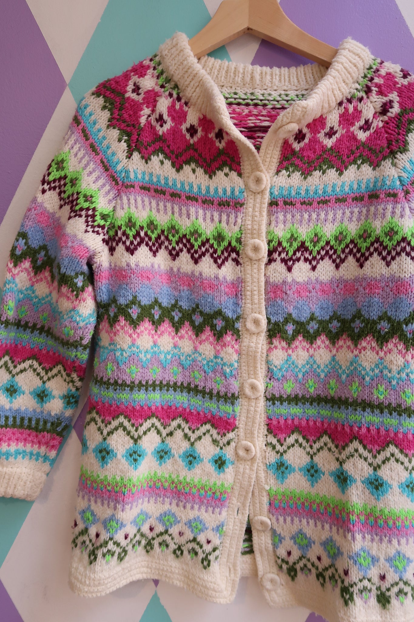 Vintage 1980s hand knit cardigan featuring a vibrant Fair Isle–inspired pattern in shades of pink, lilac, green, blue, and cream. Designed with chunky knit texture, full button front, and ribbed cuffs and hem, this cozy sweater showcases traditional craftsmanship with a playful, colorful twist.