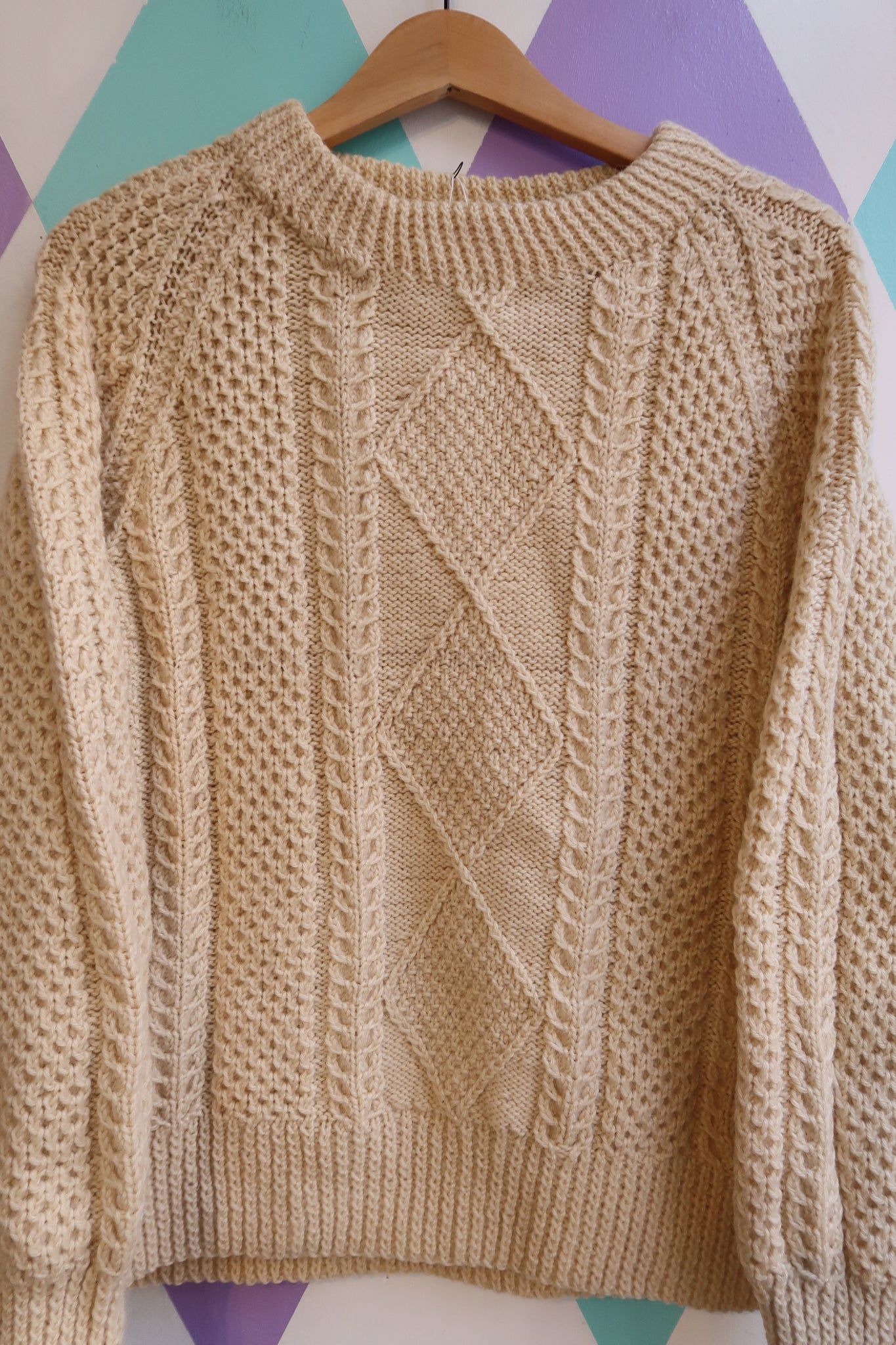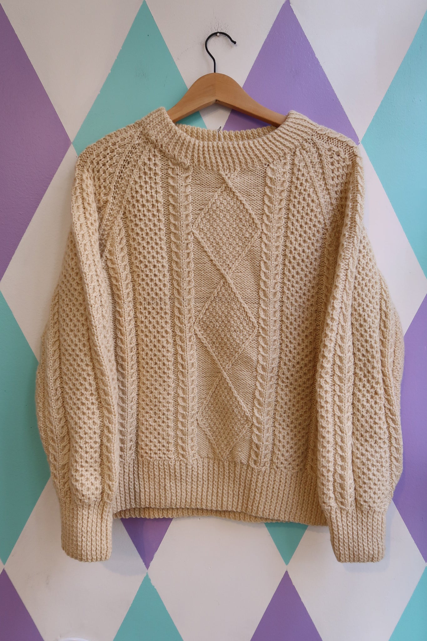 Vintage 1980s handmade fisherman sweater in a classic cream color featuring a beautifully detailed cable and diamond knit pattern. Crafted from soft, chunky wool with a crew neckline, ribbed cuffs and hem, and a slightly slouchy fit for that timeless coastal-inspired look.