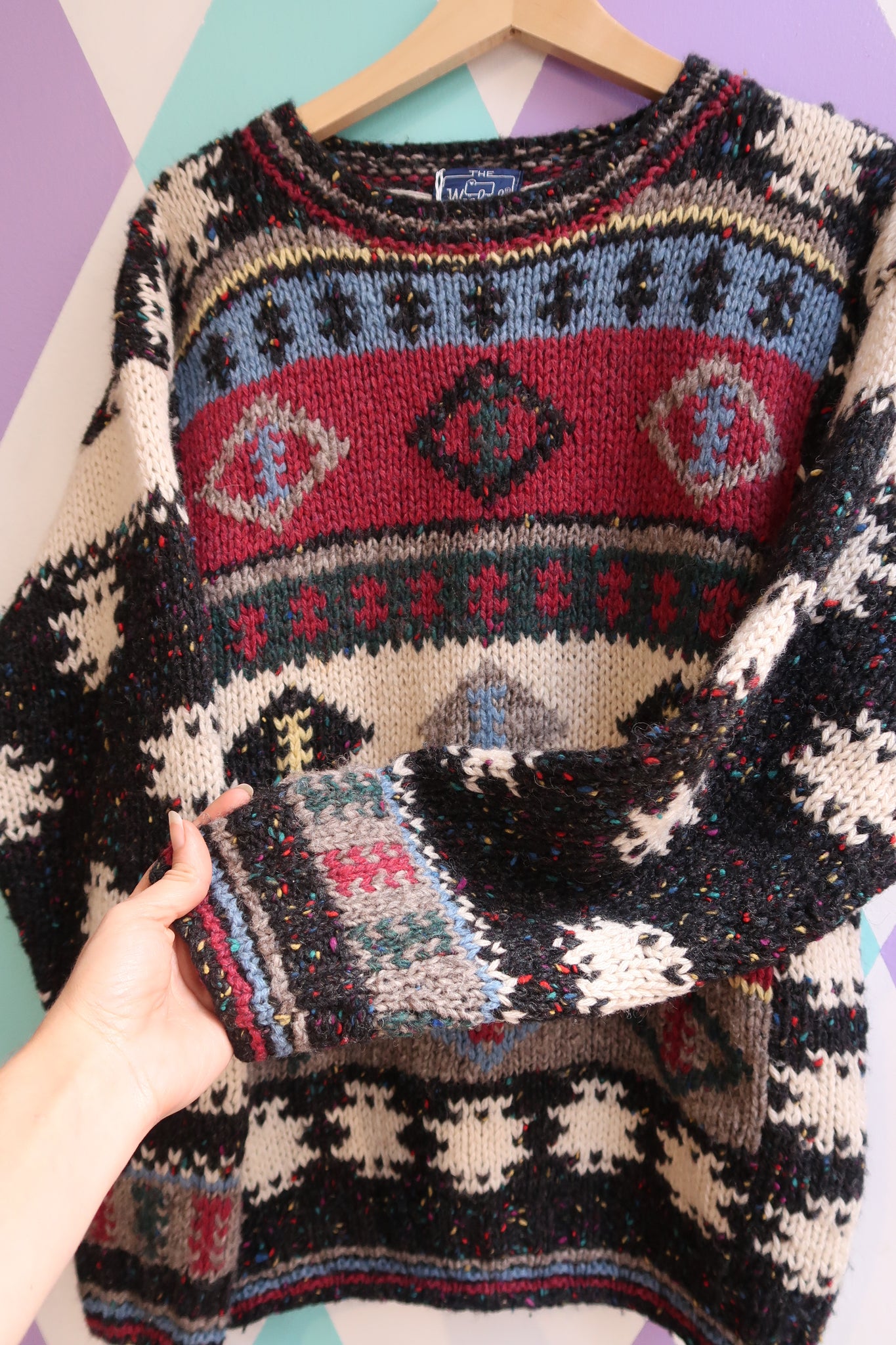 Vintage 1980s Woolrich Woman sweater featuring a bold Southwestern-inspired geometric pattern in shades of cream, black, red, blue, and tan. Crafted from a thick, speckled wool knit, this piece showcases Woolrich’s signature quality with a crew neckline, relaxed fit, and heavyweight texture that feels warm and substantial.