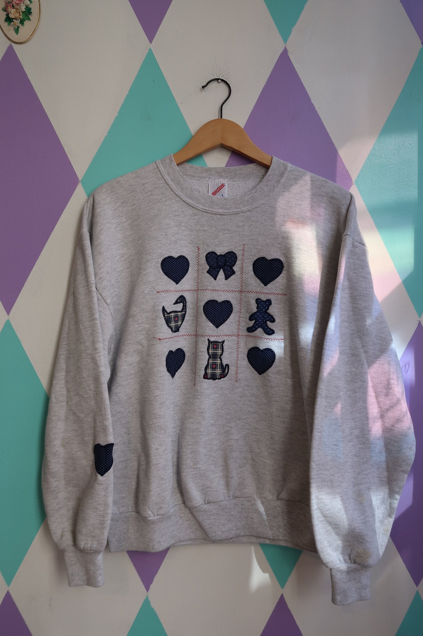 Vintage 1990s light heather gray sweatshirt featuring a whimsical navy appliqué grid design with hearts, a bow, teddy bear, and plaid cats. Detailed with contrasting red stitching and matching navy heart elbow patches on both sleeves. Classic crewneck cut with ribbed cuffs and hem, offering a relaxed, cozy fit typical of 90s casualwear