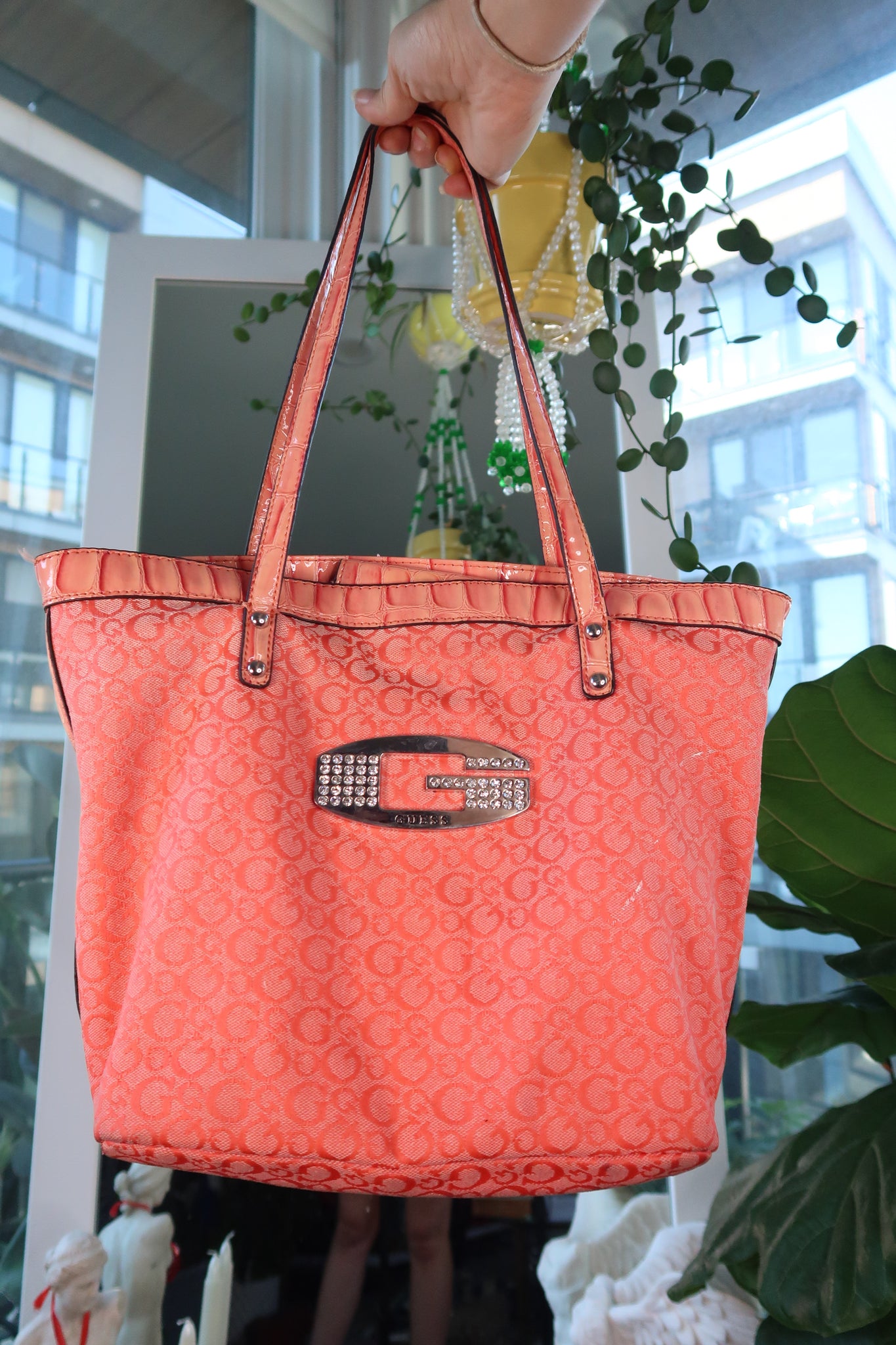 This vintage 2000s Guess tote bag embodies true Y2K glam with its coral monogram jacquard exterior and patent faux crocodile trim. The front features the iconic silver rhinestone “G” logo plate, giving it that unmistakable early-2000s sparkle. Spacious yet stylish, it’s the perfect everyday carryall for adding a pop of statement color to any outfit.