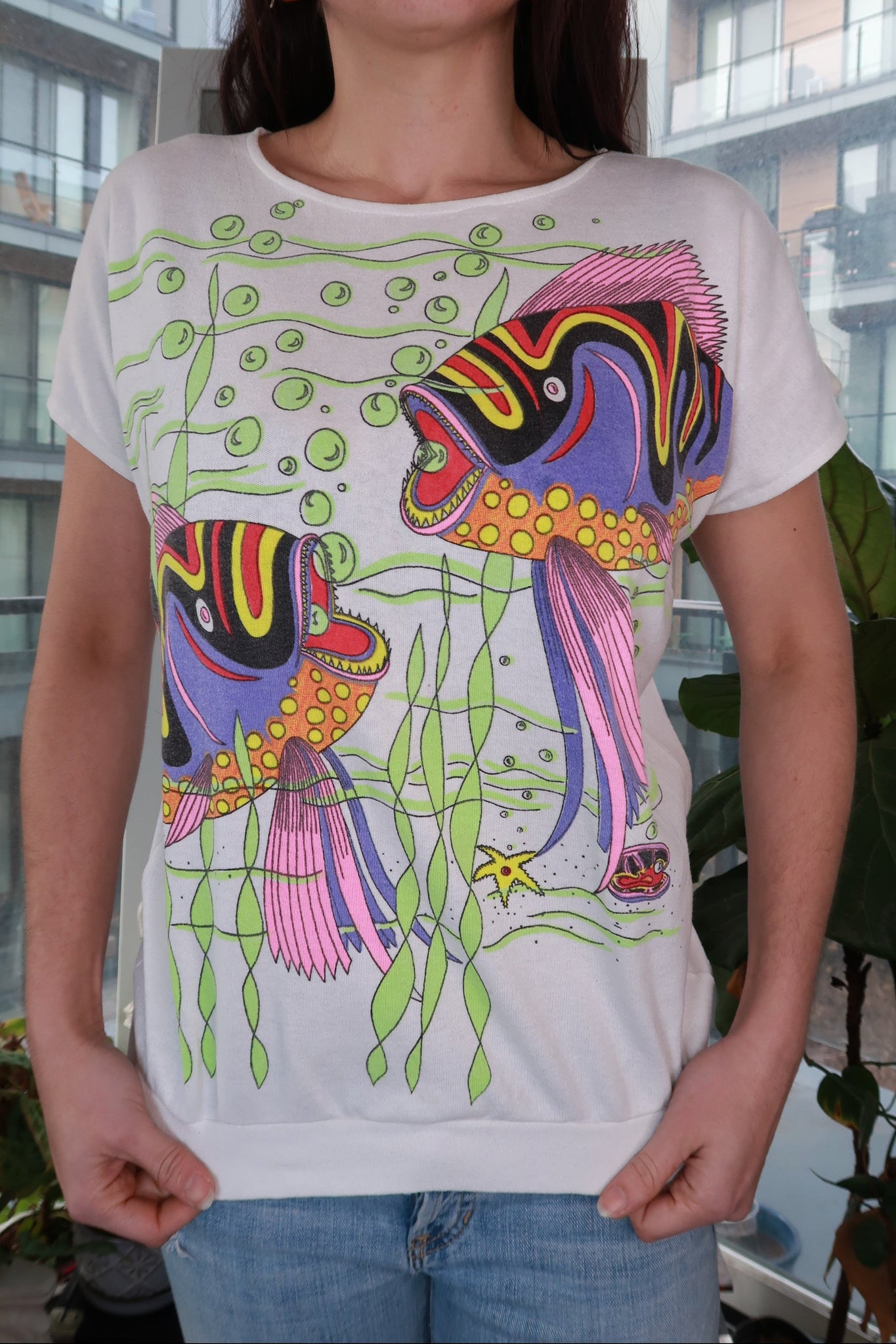 Vintage 2000s graphic sweatshirt tee featuring a bold psychedelic underwater scene with two vibrant tropical fish swimming through bright green seaweed and bubbles. The graphic pops with neon shades of pink, lime green, purple, yellow, and black, creating a playful aquarium-inspired design that captures the colorful Y2K novelty aesthetic. Designed with a relaxed short sleeve silhouette and soft white base that lets the graphic stand out. A fun statement piece perfect for pairing with denim, cargos, or mini skirts for a bright early-2000s outfit.