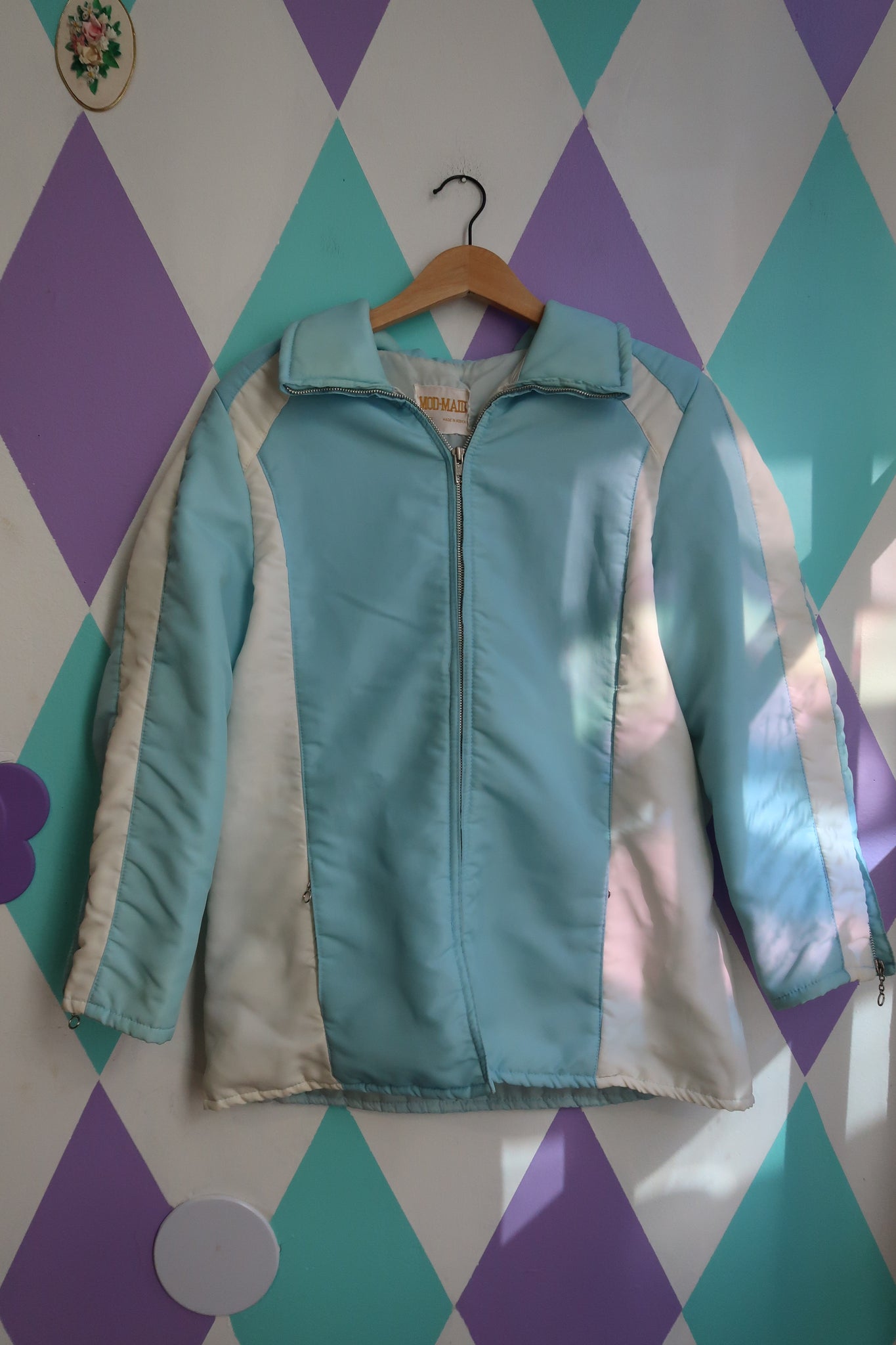 This vintage 1970s ski jacket features a powder blue and ivory colorblock design with a zip front closure, collared neckline, and zippered cuffs for that true retro slope style. The lightly padded structure offers both warmth and flexibility, while the streamlined silhouette and contrast side panels give it a sporty, flattering fit.