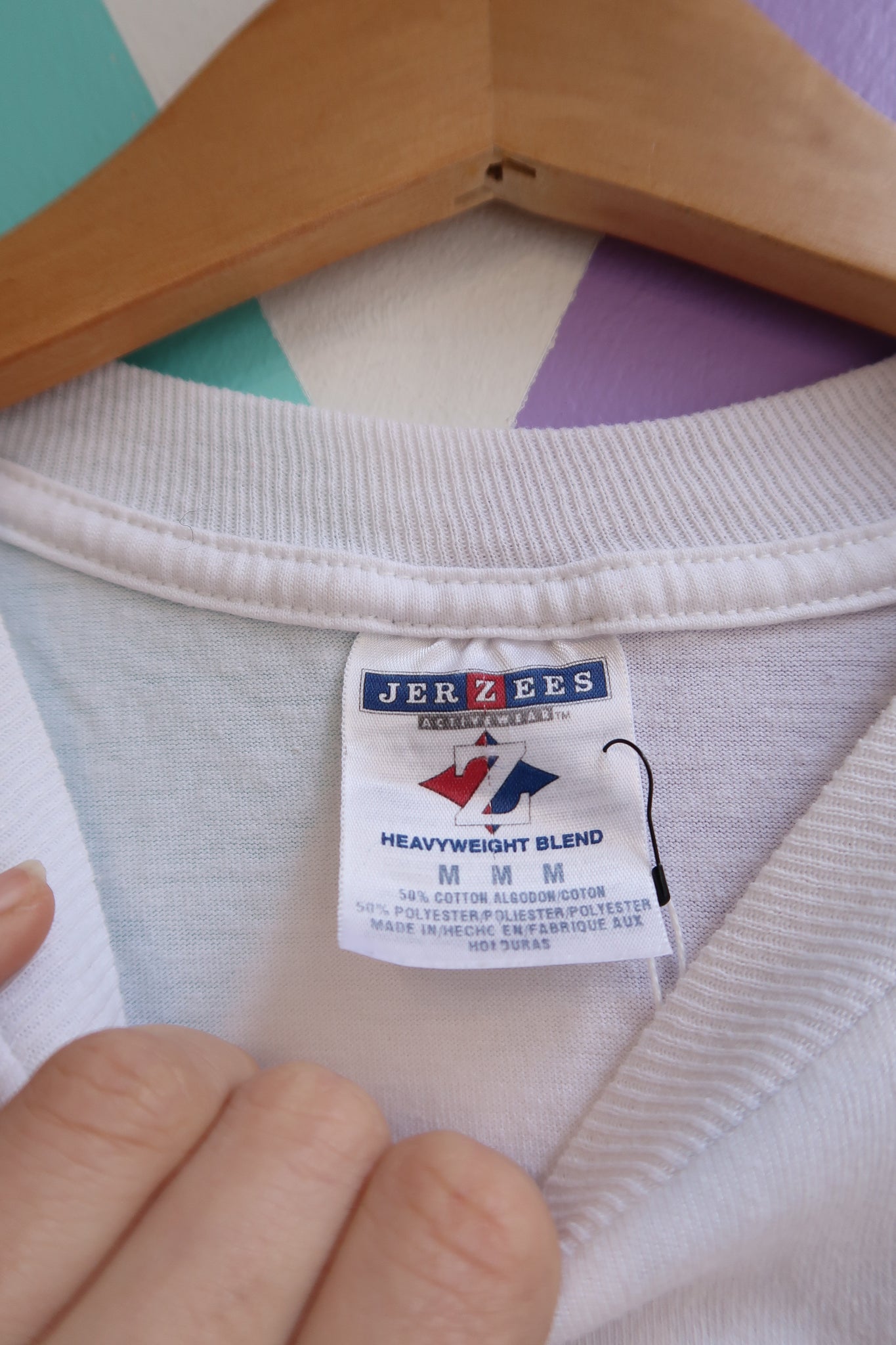 This vintage white T-shirt features a charming pumpkin and autumn leaf graphic in soft orange, green, and yellow tones — a perfect nod to cozy fall days. Lightweight with a relaxed fit, it’s ideal for layering under flannels or cardigans all season long.